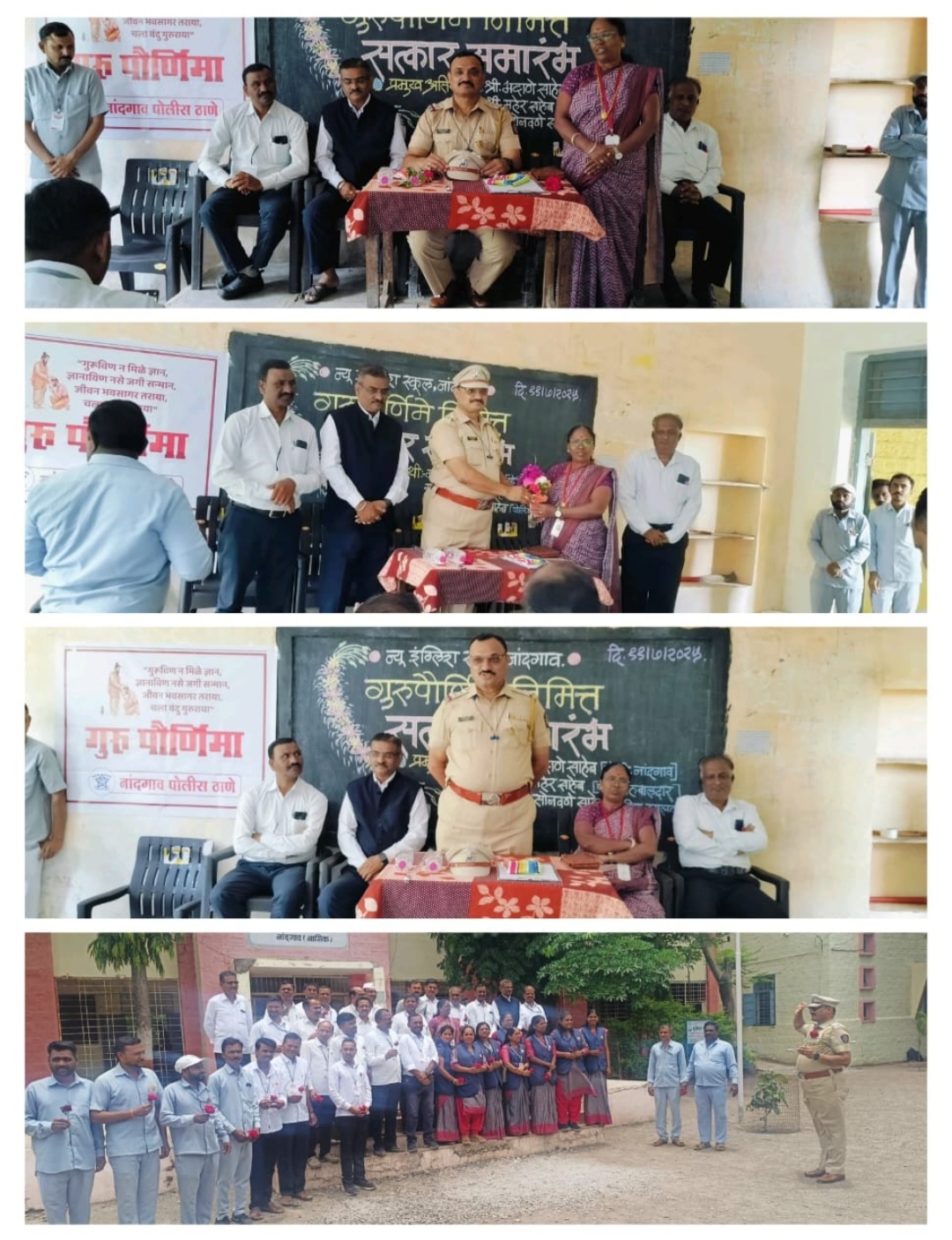 नांदगाव -(. प्रतिनिधी ) मविप्र संचलित न्यू इंग्लिश स्कूल नांदगाव मध्ये नांदगाव पोलीस ठाण्याच्या वतीने न्यू इंग्लिश स्कूल नांदगाव, औद्योगिक प्रशिक्षण केंद्र नांदगाव ,आदर्श प्राथमिक शाळा नांदगाव या तीनही संकुलांच्या शिक्षकांचा गुरुपौर्णिमा निमित्ताने सन्मान करण्यात आला. या कार्यक्रमाचे प्रास्ताविक विद्यालयाच्या मुख्याध्यापिका श्रीमती ज्योती काळे यांनी केले. या कार्यक्रमाच्या अध्यक्षस्थानी नांदगाव पोलीस ठाण्याचे पोलीस निरीक्षक श्री. भदाणे साहेब होते. व्यासपीठावर न्यू इंग्लिश स्कूलच्या मुख्याध्यापिका श्रीमती ज्योती काळे , औद्योगिक प्रशिक्षण केंद्राचे प्राचार्य श्री जाधव सर ,आदर्श प्राथमिक शाळेचे मुख्याध्यापक श्री अविनाश सोळुंके सर परिवेक्षक श्री अविनाश शेवाळे सर उपस्थित होते.त्यानंतर कार्यक्रमाचे अध्यक्ष श्री भदाने साहेब यांचा हस्ते, तसेच त्यांच्या समावेश असलेले श्री मेहर दादा ,श्री सोनवणे दादा, श्री जायभावे दादा, श्री ब्रह्मावत दादा, यांच्या हस्ते या तीनही संकुलांच्या शिक्षकांचा गुरुपौर्णिमा निमित्ताने सन्मान करण्यात आला. अध्यक्षीय भाषणामध्ये श्री. भदाणे साहेब यांनी आपला यशाचा जीवन प्रवास कसा झाला हे सांगितले .तसेच त्यांनी आपल्या मनोगतून शिक्षकांप्रती आदरभाव व्यक्त केला. उच्च पदस्थ अधिकारी होण्याच्या मागे शिक्षकांची मार्गदर्शन महत्त्वाचे असते हे त्यांनी सांगितले. या कार्यक्रमाचे सूत्रसंचालक श्री शरद आहेर यांनी केले तर आभार प्रदर्शन श्री दत्तात्रेय भिलोरे यांनी केले.