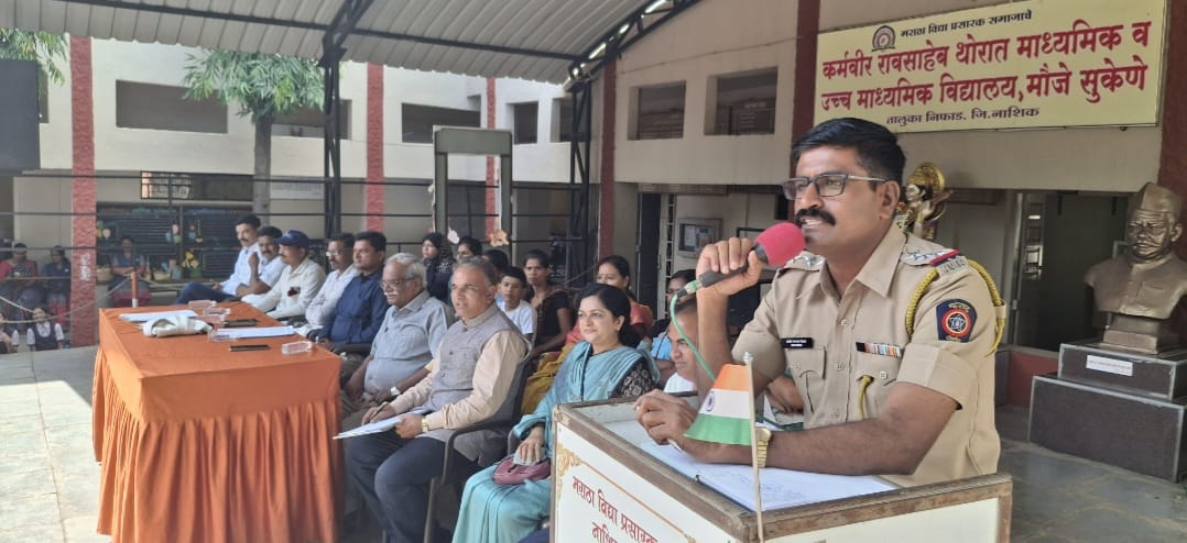 मौजे सुकेणे ता निफाड विद्यालयात विद्यार्थ्यांशी संवाद साधताना पोलीस निरीक्षक समीर केदार, व्यासपीठावर उपसभापती मोगल, प्राचार्य दवंगे व आदी