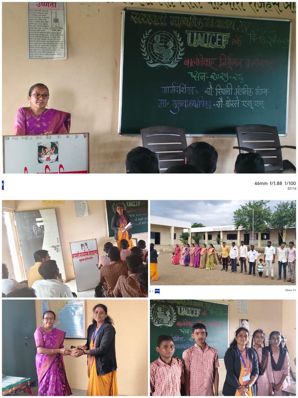 मुळ डोंगरी (प्रतिनिधी)14 जुलै रोजी *श्री संत सेवालाल महाराज सेवाभावी संस्था संचलित सरस्वती माध्यमिक विद्यालय येथे* *युनिसेफ या संघटनेमार्फत बालविवाह* *च्या समस्येवर* एक कार्यशाळा आयोजित करण्यात आली होती या कार्यशाळेत या कार्यक्रमाचे अध्यक्ष विद्यालयाच्या माननीय मुख्याध्यापिका सौ बोरसे एस. एस. मॅडम यांनी स्वीकारले व युनिसेफ संस्थेच्या नाशिक विभागाच्या सदस्या श्रीमती मंडलिक मॅडम यांनी प्रमुख पाहुणे स्थान स्वीकारून बालविवाह प्रतिबंध या समस्येवर विद्यार्थी व पालक यांना उदबोधन करत संघटनेच्या अहवालानुसार अजूनही भारतात अनेक ठिकाणी अल्पवयीन मुलींचे विवाह करण्यात येतात याचा शिक्षणावर, आरोग्यावर ,भविष्यावर गंभीर परिणाम होतात. आजही भारतात दहा लाख मुली अठरा वर्ष होण्याआधीच विवाह बंधनात अडकतात ही समस्या जागतिक पातळीवर जास्तीत जास्त असून सर्वाधिक ग्रामीण भागात गरीब कुटुंब सामाजिक परंपरांचा अभाव यामुळे मुख्य कारण आहे असे लक्षात येते म्हणूनच युनिसेफ संस्था व सरकार आणि स्वयंसेवी संस्थांना बालविवाहाच्या विरोधात ठोस उपाय योजना राबवण्याचे आवाहन केले आहे. मुलींच्या शिक्षणाला चालना देणे सामाजिक जनजागृती मोहीम आणि कठोर कायदे. संहिता लागू करणे अशा विविध उपायांची गरज असल्याचे त्यांनी आपल्या भाषणातून व्यक्त केले.भारत सरकार”ने मुलींच्या समान हक्कासाठी बेटी बचाओ बेटी पढाओ” ‘सुकन्या समृद्धी योजना’ यासारख्या विविध योजनांच्या माध्यमातून त्यांचे सक्षम सशक्तिकरण करण्यासाठी पावले उचलली असूनही पण आपल्याला प्रत्यक्षात त्याचा ठोस अभाव पाहावयास मिळतो ग्रामीण पातळीवर जागृतीचा अभाव असून ही समस्या नष्ट करण्यासाठी आपल्याला शालेय स्तरावरून प्रयत्न केले पाहिजे म्हणून संघटनेने प्रत्येक शाळेत जाऊन बालविवाह उद्बोधन कार्यशाळा आयोजित केली आणि त्याला आमच्या विद्यालयातील पालक व विद्यार्थ्यांनी भरभरून प्रतिसाद दिला व मंडलिक मॅडम यांनी मुलगा मुलगी समान ही कृती प्रत्यक्ष कृतीद्वारे करून दाखवली. या कार्यक्रमाचे आभार प्रदर्शन विद्यालयातील सहशिक्षक पाटील सर यांनी केले. अशा प्रकारे ही उदबोधन शाळा संपन्न झाली या प्रसंगी विद्यालयातील सर्व शिक्षक शिक्षिका शिक्षकेतर कर्मचारी पालक वर्ग उपस्थित होते.