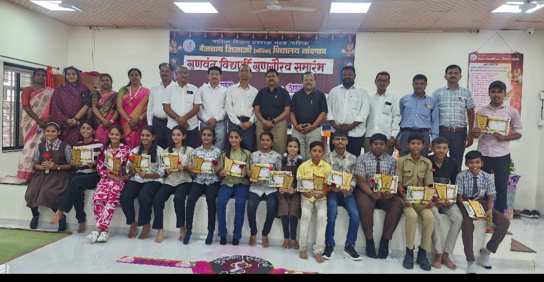 नांदगाव (वार्ताहार)- “नाशिक शिक्षण प्रसारक मंडळ,संचलित व्ही.जे.हायस्कूल नांदगाव येथे शुक्रवार दिनांक १८/७/२०२५ रोजी गुणंवत विद्यार्थी गुणगौरव समारंभ मा अध्यक्ष शालेय समिती श्री.संजीव धामणे कार्यक्रमाचे प्रमुख पाहुणे मा.श्री पवन जयचंद पाटणी (माजी विद्यार्थी , प्रसिद्ध उदयोग पती),श्री. निलेश पटणी यांच्या उपस्थित संपन्न झाला . कार्यक्रमाचे प्रास्ताविक मा. मुख्या श्री. ठाकरे सरांनी करून दिला शाळेच्या निकालाची परंपरा व वैशिष्टये विषद केली . इ. १०वी केद्रांत व शाळेत प्रथम क्रमांक प्राप्त विद्यार्थीनी कु.थोरे रोशनी व कु प्रेम दुगड यांनी मनोगत व्यक्त करतांना शाळेचे व शिक्षकांचे ऋण व्यक्त केले गुणवंत व्हा यशवंत व्हा . मिळालेले संस्कार व मुल्य / शिस्त हेच यशस्वी जीवनाचा मंत्र आहे. हे विचार प्रमुख पाहुणे पवन जयचंद पाटणी यांनी व्यक्त केले तसेच शालेय समिती अध्यक्ष श्री संजीव धामणे यांनी मूल्य व संस्कार कसे उपयोगी पडतात ते सांगितले