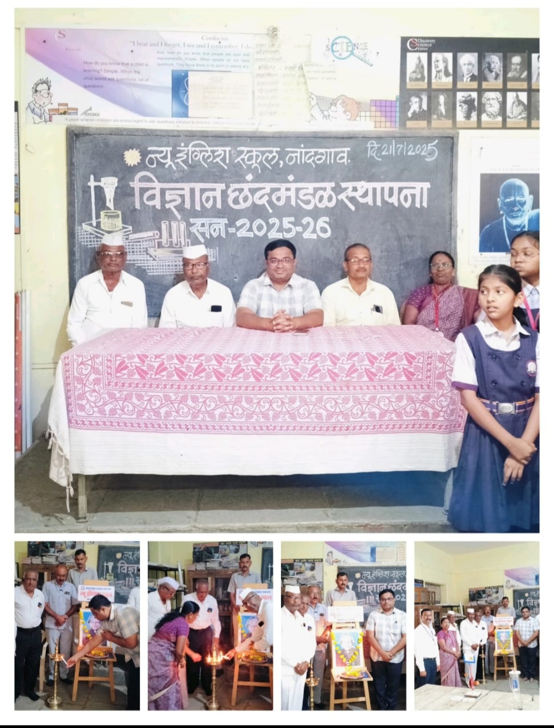 नांदगाव – मविप्र संस्थेचे न्यू इंग्लिश स्कूल नांदगाव या विद्यालयात सन 2025 26 या शैक्षणिक वर्षाकरिता विज्ञान छंद मंडळाची स्थापना करण्यात आली. या कार्यक्रमाच्या अध्यक्षस्थानी तालुका संचालक श्री अमित भाऊ पाटील व्यासपीठावर श्री विजय काकळीज , बाळासाहेब कदम, राजेश पाटील ,मुख्याध्यापिका ज्योती काळे ,पर्यवेक्षक अविनाश शेवाळे होते. कार्यक्रमाचे सुरुवात स्वागत गीताने करण्यात आली. पर्यवेक्षक अविनाश शेवाळे यांनी प्रास्ताविकातून विज्ञान छंद मंडळ व महत्त्व स्पष्ट केले. मान्यवरांचा हस्ते दीप प्रज्वलन व डॉ. ए पी जे अब्दुल कलाम यांच्या प्रतिमेचा पूजन करण्यात आले. अण्णासाहेब दुकळे यांनी विज्ञानातील उद्दिष्ट स्पष्ट केले. गजेंद्र माताडे यांनी मागील वर्षाचा विज्ञान संघ मंडळाचा शैक्षणिक आढावा सांगितला. प्रणोद गोटे यांनी वैज्ञानिक उपकरणांच्या माध्यमातून प्रयोग प्रात्यक्षिक करून दाखवले. गवळी जया, बिडवे सरला, गणेश ढोणे यांच्या मार्गदर्शनाखाली विज्ञान छंद मंडळाची स्थापना झाली. श्री विजय काकळीज यांनी आपल्या मनोगतात विद्यार्थ्यांचा वैज्ञानिक दृष्टिकोन वाढवावा या संदर्भात मार्गदर्शन सूचना केल्या. आपल्या अध्यक्षीय भाषणामध्ये तालुका संचालक श्री. अमित भाऊ पाटील बोलताना विज्ञान छंद मंडळाच्या सर्व सदस्यांना शुभेच्छा दिल्या व विज्ञान हा विद्यार्थ्यांचा प्रगतीचा महत्त्वाचा विषय आहे हे सांगितले. कार्यक्रम यशस्वी होण्याकरिता प्रयोगशाळा परिचर यशवंत काकळीज , विद्यालयातील सर्व शिक्षक,शिक्षिका, शिक्षकेतर कर्मचारी यांचे मोलाचे सहकार्य लाभले. कार्यक्रमाचे सूत्रसंचालन भाऊसाहेब सोनवणे तर आभार प्रदर्शन नरेंद्र पाटील यांनी केले.