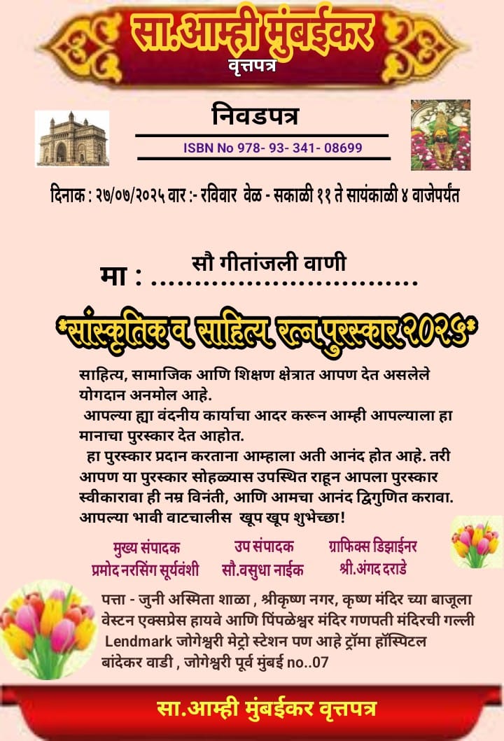 आम्ही मुंबईकर हे सुपरिचित इ साप्ताहिक साहित्यिक घडामोडीचा उत्तम आढावा घेणारे साप्ताहिक आहे. साप्ताहिक प्रथमतः विविध क्षेत्रातील मान्यवरांना त्यांच्या यशस्वी आणि भरीव योगदानासाठी पुरस्कार प्रदान करणार आहे. हिरकणी गीतांजली वाणी यांची त्यांनी साहित्यिक क्षेत्रात केलेल्या उल्लेखनीय कार्यासाठी साप्ताहिक आम्ही मुंबईकर तर्फे सांस्कृतिक साहित्यरत्न पुरस्कारासाठी निवड झाली आहे. हिरकणी गीतांजली वाणी ह्या ग्रंथालय क्षेत्रात कार्यरत आहेत. वाचन संस्कृती जोपसणारे अनेक उपक्रम त्यांनी ग्रंथालयीन कार्यात राबवले आहेत त्यात विशेष उल्लेखनीय राष्ट्रीय परिषद व राष्ट्रीय कार्यशाळा आहे. राष्ट्रीय परिषदेत आलेल्या संशोधित लेखाच्या पुस्तिकेचे संपादक म्हणुन त्यांनी काम पाहिले आहे. साहित्यातील त्यांच्या रुचितून त्यांचे दोन कविता संग्रह प्रकाशित झाले आहेत. दर्पण चारोळी संग्रह (प्रकाशन साल २००६) आणि काव्यांगी अष्टाक्षरी काव्यसंग्रह (प्रकाशन साल २०२१) तसेच नवरंग प्रातिनिधिक काव्यसंग्रहाच्या संपादक म्हणुन देखील त्यांनी काम पाहिले आहे.(प्रकाशन साल २०२२) अखिल भारतीय मराठी साहित्य परिषद मुंबई विभाग अंतर्गत असणाऱ्या उत्तर मुंबई अध्यक्षा म्हणुन जबाबदारी सांभाळली आहे. साल २०२४ साली शब्दशिल्प कलाविष्कार संघ नोंदणीकृत संस्थेच्या प्रथम राज्यस्तरीय संमेलनाच्या स्वागतध्यक्षा म्हणून जबाबदारी सांभाळली आहे.