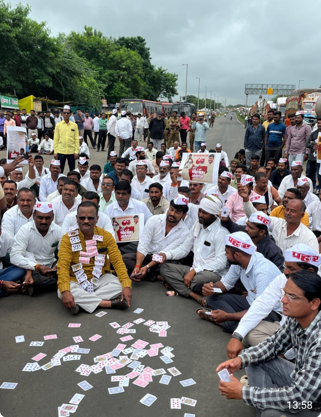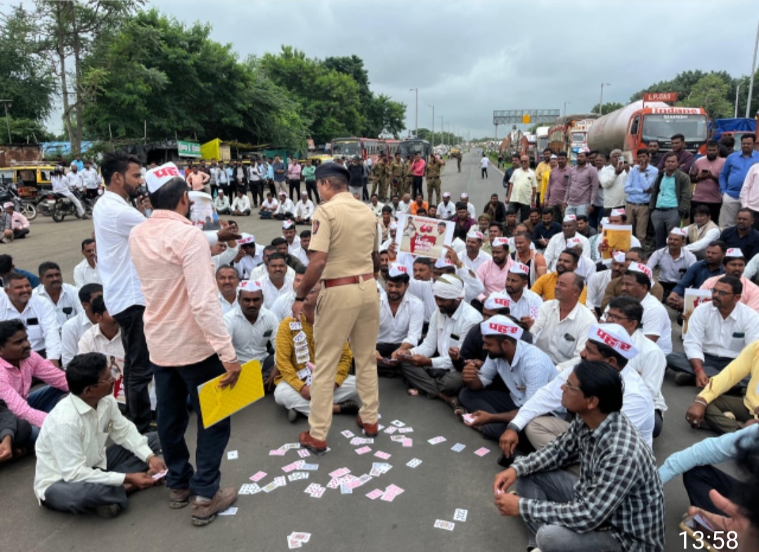, नाशिक – विविध प्रलंबित मागण्यांसाठी आज प्रहार जनशक्ती पक्षाच्या वतीने राज्यभर चक्काजाम आंदोलन छेडण्यात आले. चांदवड येथे NH-3 महामार्गाच्या चौफुलीवर शेतकऱ्यांनी सलग दीड तास रस्तारोको करत सरकारविरोधात तीव्र रोष व्यक्त केला.शेतकऱ्यांनी सांगितले की, निवडणुकीनंतर सरकारला शेतकऱ्यांचा पूर्ण विसर पडला आहे. मुख्यमंत्री देवेंद्र फडणवीस यांनी निवडणुकीच्या काळात चांदवड कृषी उत्पन्न बाजार समितीच्या सभेत “सातबारा कोरा” करण्याचे आश्वासन दिले होते. मात्र, आजपर्यंत त्या आश्वासनांची पूर्तता झाली नसल्यामुळे संतप्त शेतकऱ्यांनी रस्त्यावर उतरत सरकारचा समाचार घेतला.विशेष लक्ष वेधून घेतले ते कृषी मंत्री माणिकराव कोकाटे यांच्या निषेधाने. आंदोलनकर्त्यांनी मंत्री कोकाटे हे विधीमंडळात शेतकऱ्यांचे प्रश्न मांडण्याऐवजी रम्मी खेळण्यात व्यस्त असल्याचा आरोप करत त्यांच्या गळ्यात पत्त्यांच्या माळा घालून, रस्त्यावर पत्ते खेळत अनोख्या पद्धतीने निषेध व्यक्त केला.आंदोलनादरम्यान ऍम्ब्युलन्ससाठी मार्ग मोकळा ठेवण्यात येत आंदोलन शिस्तबद्ध पद्धतीने पार पाडले गेले.