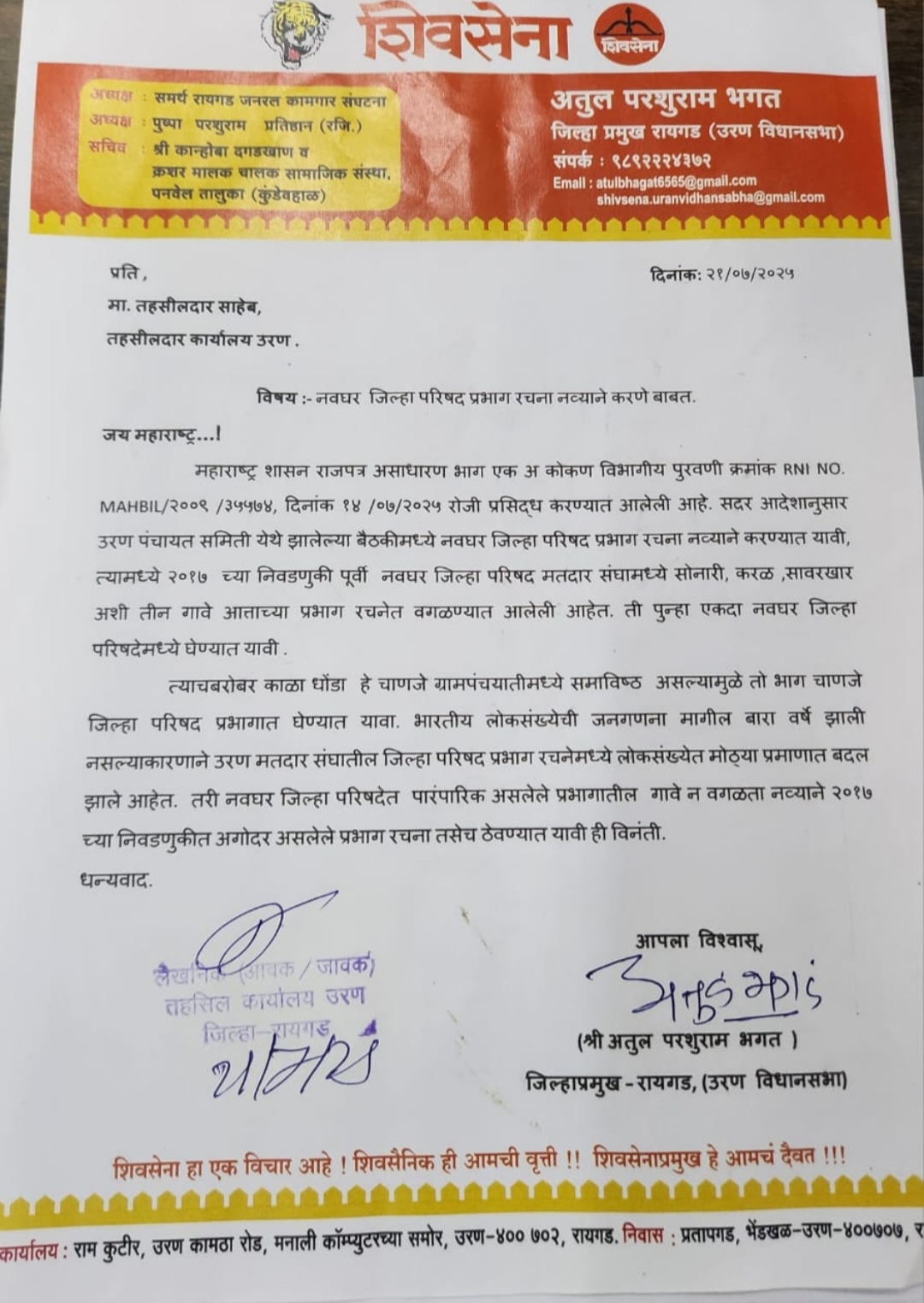 उरण दि २४(विठ्ठल ममताबादे )महाराष्ट्र शासन राजपत्र असाधारण भाग एक अ कोकण विभागीय पुरवणी क्रमांक RNI NO. MAHBIL/२००९/३५५७४, दिनांक १४/०७/२०२५ रोजी प्रसिद्ध करण्यात आलेली आहे. सदर आदेशानुसार उरण पंचायत समिती येथे झालेल्या बैठकीमध्ये नवघर जिल्हा परिषद प्रभाग रचना नव्याने करण्यात यावी, त्यामध्ये २०१७ च्या निवडणुकी पूर्वी नवघर जिल्हा परिषद मतदार संघामध्ये सोनारी, करळ, सावरखार अशी तीन गावे आताच्या प्रभाग रचनेत वगळण्यात आलेली आहेत. ती पुन्हा एकदा नवघर जिल्हा परिषदेमध्ये घेण्यात यावी.त्याचबरोबर काळा धोंडा हे चाणजे ग्रामपंचयातीमध्ये समाविष्ठ असल्यामुळे तो भाग चाणजे जिल्हा परिषद प्रभागात घेण्यात यावा अशी मागणी शिवसेना शिंदे गटाचे रायगड जिल्हा प्रमुख अतुल भगत यांनी उरणचे तहसीलदार उद्धव कदम यांच्याकडे पत्रव्यवहारद्वारे केली आहे.भारतीय लोकसंख्येची जनगणना मागील बारा वर्षे झाली नसल्याकारणाने उरण मतदार संघातील जिल्हा परिषद प्रभाग रचनेमध्ये लोकसंख्येत मोठ्या प्रमाणात बदल झाले आहेत. तरी नवघर जिल्हा परिषदेत पारंपारिक असलेले प्रभागातील गावे न वगळता नव्याने २०१७ च्या निवडणुकीत अगोदर असलेले प्रभाग रचना तसेच ठेवण्यात यावी अशी मागणी तहसीलदार उद्धव कदम यांच्याकडे पत्रव्यवहाराच्या माध्यमातून व हरकत घेऊन जिल्हाप्रमुख अतुल भगत यांनी केली आहे.