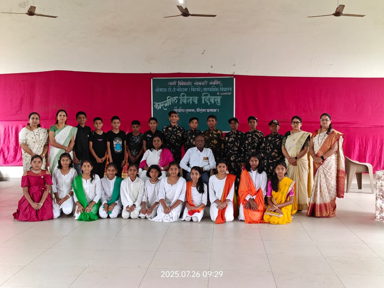 नाशिक, २६ जुलै – श्रीमान टी.जे. चौहान( बिटको )हायस्कूल,मोरवाडी, नाशिक विद्यालयात आज कारगिल विजय दिवस मोठ्या उत्साहात व देशभक्तीच्या भावनेने साजरा करण्यात आला. या निमित्ताने विविध कार्यक्रमांचे आयोजन करण्यात आले होते. शाळेच्या मुख्याध्यापिका माननीय सौ. माळी मॅडम,पर्यवेक्षक श्री. गहाणकरी सर तसेच प्रमुख अतिथी माजी सैनिक श्री विठ्ठल सिंग राजपूत सर व्यासपीठावर उपस्थित होते.कार्यक्रमाची सुरुवात भारतमातेच्या प्रतिमेला पुष्पहार अर्पण करून व दीप प्रज्वलन करून करण्यात आली. विद्यार्थ्यांना भारतीय सैनिकांनी कारगिल वर कसा विजय मिळवला यावर आधारित एक छोटासा व्हिडिओ दाखवण्यात आला.विद्यार्थ्यांनी देशभक्तीपर गीत, नाटिका सादर करून उपस्थितांची मने जिंकली. तसेच विद्यालयातील विद्यार्थ्यांनी सीमेवरील जवानांसाठी राख्या सुद्धा बनवल्या.या कार्यक्रमात प्रमुख पाहुणे म्हणून माजी सैनिक श्री. विठ्ठल सिंग राजपूत उपस्थित होते. त्यांनी आपल्या भाषणात युद्धातील अनुभव सांगून विद्यार्थ्यांमध्ये देशप्रेम जागवले. कार्यक्रमाच्या यशस्वीतेसाठी इयत्ता सातवीच्या वर्ग शिक्षकांनी परिश्रम घेतले.कार्यक्रमाच्या शेवटी सर्वांनी ‘जय हिंद, वंदे मातरम’च्या घोषणांनी परिसर दणाणून सोडला. संपूर्ण शाळा देशभक्तीच्या रंगात रंगली होती. कारगिल विजय दिवसाच्या निमित्ताने विद्यार्थ्यांमध्ये देशसेवेची भावना दृढ करण्याचा प्रयत्न शाळेने यशस्वीपणे केला.–