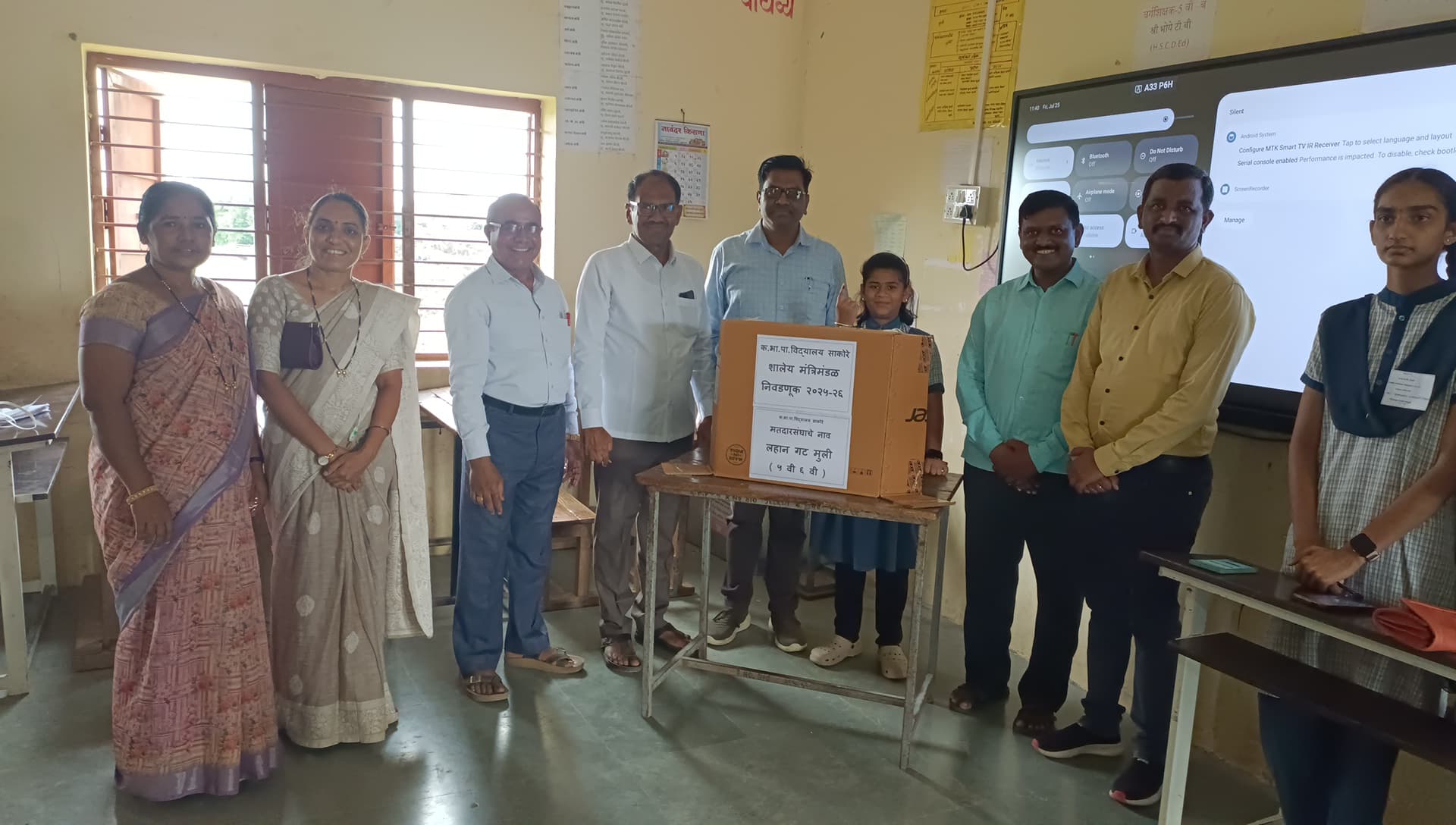 रयत शिक्षण संस्थेचे कर्मवीर भाऊराव पाटील माध्यमिक व उच्च माध्यमिक विद्यालय, साकोरे येथे दिनांक २५ जुलै २०२५ रोजी शालेय मंत्रिमंडळ निवडणूक मोठ्या उत्साहात व लोकशाही पद्धतीने पार पडली. या निवडणुकीत इयत्ता ५ वी ते १० वी या वर्गातील सर्व विद्यार्थ्यांनी मतदानाचा हक्क बजावला.शाळेच्या विविध गटांमध्ये (लहान, मध्यम व मोठा) मुलामुलींचे स्वतंत्र मतदान केंद्र तयार करण्यात आले होते. सदर निवडणूक मोबाईल ईव्हीएम द्वारे घेण्यात आली. त्यामुळे विद्यार्थ्यांना लहानपणापासूनच लोकशाही मूल्य व मतदान यंत्राची ओळख होते.प्रत्येक गटासाठी स्वतंत्र मोबाईल ईव्हीएम तयार करण्यात आले होते. निवडणुकीसाठी एकूण 38 विद्यार्थ्यांनी उमेदवारी केलेली होती.या निवडणूकीत *तुषार हरिश्चंद्र खैरनार हा मुख्यमंत्री* पदावर विजयी झाला तर *उपमुख्यमंत्री म्हणून कु. साक्षी संजय पवार* ही विजयी झाली. कु.सुचिता बाबासाहेब बोरसे, साहिल दत्तू शेवाळे,कु. गौरी गणेश बच्छाव, धीरज संदीप बोरसे, पूर्वेश समाधान सोनवणे,कु. सानवी संतोष निकम या विद्यार्थ्यांची मंत्री म्हणून त्या त्या गटासाठी निवड झालेली आहे.असे शालेय अष्टप्रधान मंडळ निवडले गेले.ही निवडणुक मुख्याध्यापक श्री झाल्टे सर यांच्या मार्गदर्शनाखाली व श्री. माळी सर यांच्या नियोजनात झाली.मुख्याध्यापक श्री. झाल्टे डी. एस., श्री. भोई सर, श्री. चौधरी सर यांनी निवडणूक निर्णय अधिकारी म्हणून जबाबदारी पार पाडली.स्कूल कमिटीचे अध्यक्ष आदरणीय श्री. रमेशकाका बोरसे यांनी स्वतः उपस्थित राहून विद्यार्थ्यांचे व उपक्रमांचे कौतुक केले. श्री.वाघेरे सर, श्री. सोनवणे सर,श्री वळवी सर यांनी निवडणूक प्रभारी म्हणून जबाबदारी पार पाडली. श्री चौरे सर यांनी व्हिडिओ द्वारे प्रसिध्दी दिली.इतर सर्व सेवकांनी नियोजनात मोलाची भूमिका बजावली. या निवडणुकीद्वारे मतदान, उमेदवारी, प्रचार, गुप्त मतदान, ईव्हीएम व मतमोजणी या संपूर्ण प्रक्रियेने विद्यार्थ्यांना प्रत्यक्ष अनुभव दिला.शाळेतील या उपक्रमाचे ग्रामस्थ व पालकांनीही विशेष कौतुक केले. यामुळे विद्यार्थ्यांमध्ये नेतृत्वगुणांचा विकास होण्यास मदत झाली.