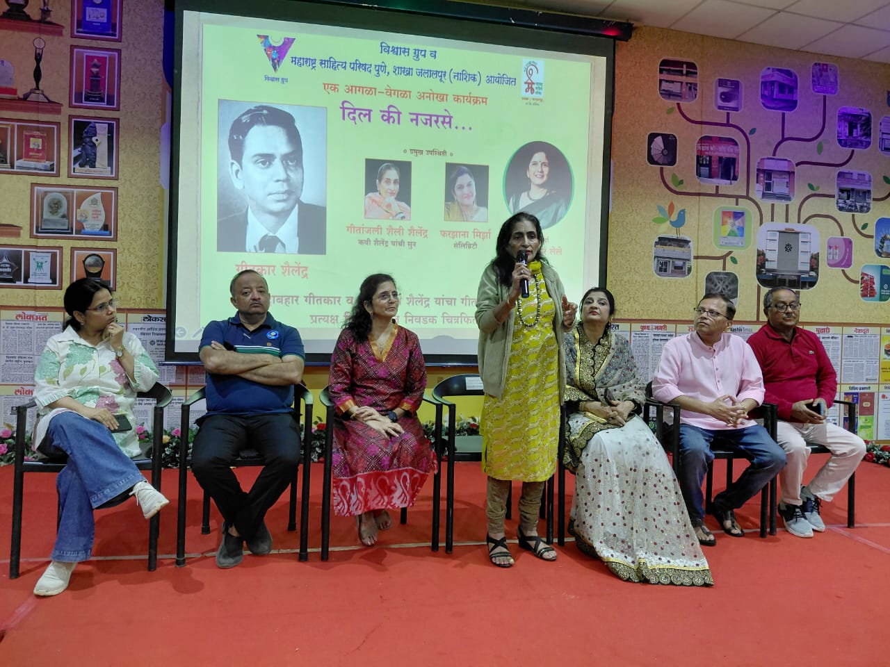 नाशिक( प्रतिनिधी) : जीवनाचे तत्त्वज्ञान साध्या-सोप्या भाषेत मांडणारे आणि मानवी भाव-भावनांना स्पर्श करणारे गीतकार शैलेंद्र यांची गीते आजही रसिकांच्या मनावर अधिराज्य गाजवत आहेत. अशा या महान गीतकारांच्या सर्जनशीलतेचा आढावा घेणारा ‘दिल की नजर से’ हा दृक-श्राव्य कार्यक्रम रसिकांसाठी पर्वणी ठरला.हा कार्यक्रम मुग्धा लेले यांनी सादर केला. विश्वास ग्रुप आणि महाराष्ट्र साहित्य परिषद, शाखा जलालपूर (नाशिक) यांच्या संयुक्त विद्यमाने विश्वास बँक डिझास्टर मॅनेजमेंट सेंटर अॅण्ड ट्रेनिंग हब, ठाकूर रेसिडेन्सी, स्वातंत्र्यवीर सावरकरनगर, गंगापूर रोड, नाशिक येथे हा कार्यक्रम पार पडला.शैलेंद्र यांच्या गीतलेखनातील आशयगर्भता, कथानकाला सुसंगत भाव आणि पडद्यावरील प्रसंगांचे नेमके चित्रण या वैशिष्ट्यपूर्ण पैलूंची प्रभावी मांडणी मुग्धा लेले यांनी केली. बसंत बहारमधील ‘जा जा रे जा बालमवा’, ‘चलत मुसाफिर मोह लिया रे’, ‘कैसे दिन बीते’, ‘बनाके जिन्दगानियां बिगाड ने से क्या मिला’, ‘आ अब लौट चले’, ‘तूने तो सबको राह दिखाई’ या निवडक गीतांच्या माध्यमातून शैलेंद्र यांच्या गीतलेखनाची अनोखी जादू रसिकांसमोर उलगडली.या प्रसंगी शैलेंद्र यांची सून गीतांजली शैली शैलेंद्र यांची प्रमुख उपस्थिती त्यांनी गीतकार शैलेंद्र यांच्या आठवणींना उजाळा दिला. शब्दांचा प्रभावी वापर कथानकाला सुसंगत भाव यांचे मिश्रण यातून त्यांचे गीत आकार घेत असे. पडद्यावरील प्रसंगाची नेमकी नस आपल्या गीतांतून ते पकडत असत. राज कपूर यांच्या अनेक चित्रपटांच्या यशाचे श्रेय शैलेंद्र यांच्या गीतांनाही असे.गीतांजली म्हणाल्या.कार्यक्रमाला सेलिब्रिटी फरझाना मिर्झा, डॉ. कैलास कमोद, विनायक रानडे, डॉ. मनोज शिंपी आदी मान्यवर उपस्थित होते. सूत्रसंचालन डॉ. स्मिता मालपुरे यांनी केले.विश्वास ग्रुपचे कुटुंबप्रमुख विश्वास ठाकूर म्हणाले, “जुन्या सिनेमातील गाणी आणि अभिनयाचे गारूड आजही रसिकांच्या मनावर आहे. त्याची प्रचिती या कार्यक्रमातून सर्वांना आली.”सदर कार्यक्रमास विश्वास को-ऑप. बँक लि., महाराष्ट्र साहित्य परिषद (पुणे) शाखा जलालपूर, विश्वास ज्ञान प्रबोधिनी अॅण्ड रिसर्च फाऊंडेशन, रेडिओ विश्वास 90.8 कम्युनिटी रेडिओ, विश्वास टर्फ आणि ग्रंथ तुमच्या दारी या उपक्रमांचे सहकार्य लाभले.