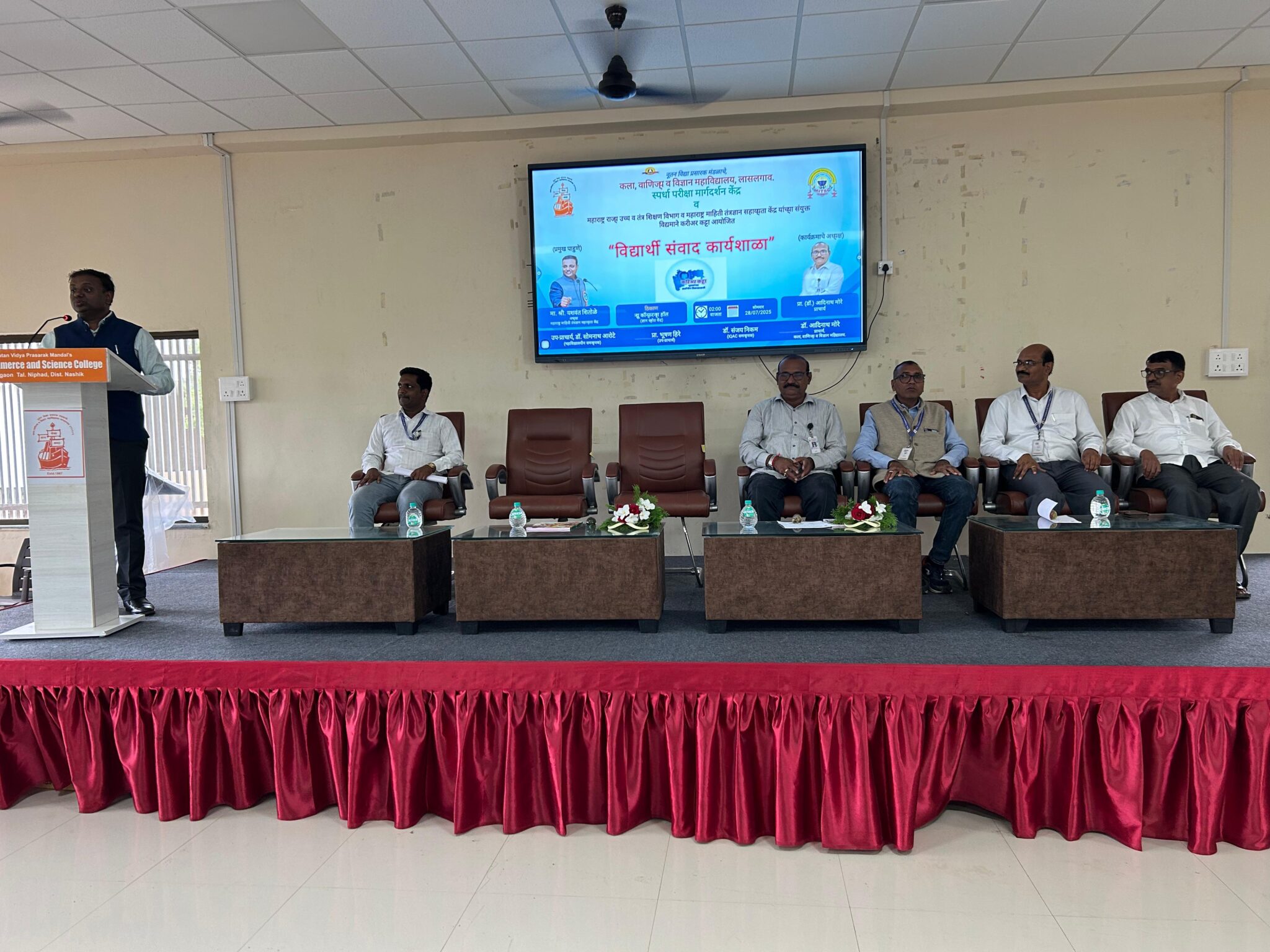 लासलगाव ( प्रतिनिधी ) : येथील नूतन विद्या प्रसारक मंडळ संचलित कला, वाणिज्य आणि विज्ञान महाविद्यालयातील स्पर्धा परीक्षा मार्गदर्शन केंद्र व महाराष्ट्र राज्य उच्च व तंत्र शिक्षण विभाग आणि महाराष्ट्र माहिती तंत्रज्ञान सहाय्यता केंद्र यांच्या संयुक्त विद्यमाने करिअर कट्टा आयोजित विद्यार्थी संवाद कार्यशाळा पार पडली. कार्यक्रमाचे प्रास्ताविक महाविद्यालयातील करिअर कट्टा समन्वयक उपप्राचार्य डॉ. सोमनाथ आरोटे यांनी केले. त्यांनी सदर उपक्रम महाविद्यालयात किती प्रभावीपणे राबवला जातो हे प्रास्ताविकातून सांगितले. सदर संवाद कार्यशाळेसाठी महाराष्ट्र माहिती तंत्रज्ञान सहाय्यता केंद्राचे अध्यक्ष माननीय श्री.यशवंत शितोळे उपस्थित होते. श्री.यशवंत शितोळे यांनी आपल्या उद्बोधनपर भाषणात महाविद्यालयीन जीवनात विद्यार्थ्यांनी एस.आय.पी. करणे खूप गरजेचे आहे एस. आय. पी. चा अर्थ सांगत असताना सिस्टिमॅटिक इन्वेस्टमेंट फॉर करिअर डेव्हलपमेंट असा स्पष्ट केला. करिअर कट्टा अंतर्गत युवकांच्या सर्वांगीण विकासासाठी कोण-कोणते वेगवेगळे उपक्रम राबवले जातात याविषयी सविस्तर मार्गदर्शन केले. उज्वल भवितव्यासाठी विद्यार्थ्यांनी करिअर कट्टा अंतर्गत विद्यार्थ्यांना उद्योजक आपल्या भेटीला, तसेच आयएएस आपल्या भेटीला या कार्यक्रमांतर्गत राज्य पातळीवरील स्पर्धा परीक्षा, महाराष्ट्र लोकसेवा आयोजित स्पर्धा परीक्षा, पोलीस भरती, केंद्रीय पातळीवरील स्पर्धा परीक्षा यासंबंधीतील मार्गदर्शन केले जाते याची विद्यार्थ्यांना सविस्तर माहिती दिली.कार्यक्रमाचे अध्यक्ष महाविद्यालयाचे प्राचार्य प्रा.(डॉ.) आदिनाथ मोरे यांनी विद्यार्थ्यांना आव्हान केले की करिअर कट्टा सारखा उपक्रमात सक्रिय सहभाग घेऊन महाविद्यालयीन जीवनात आपण आपले उज्वल भविष्य बनवू शकतो. कार्यक्रमाचे सूत्रसंचालन मानसशास्त्र विभागाचे प्रा.किशोर अंकुळनेकर यांनी केले. तर आभार प्रदर्शन संगणकशास्त्र विभागाचे प्रा.सुनिल भागवत यांनी केले. सदर कार्यक्रमासाठी महाविद्यालयाचे उपप्राचार्य प्रा.भूषण हिरे, डॉ. संजय निकम, डॉ. मारोती कंधारे, प्रा.विरेंद्र आहेर, प्रा.सृष्टी थोरात इ. उपस्थित होते. कार्यक्रमाच्या यशस्वीतेसाठी संस्थेचे जनरल सेक्रेटरी श्री.गोविंदराव होळकर यांचे मार्गदर्शन लाभले.