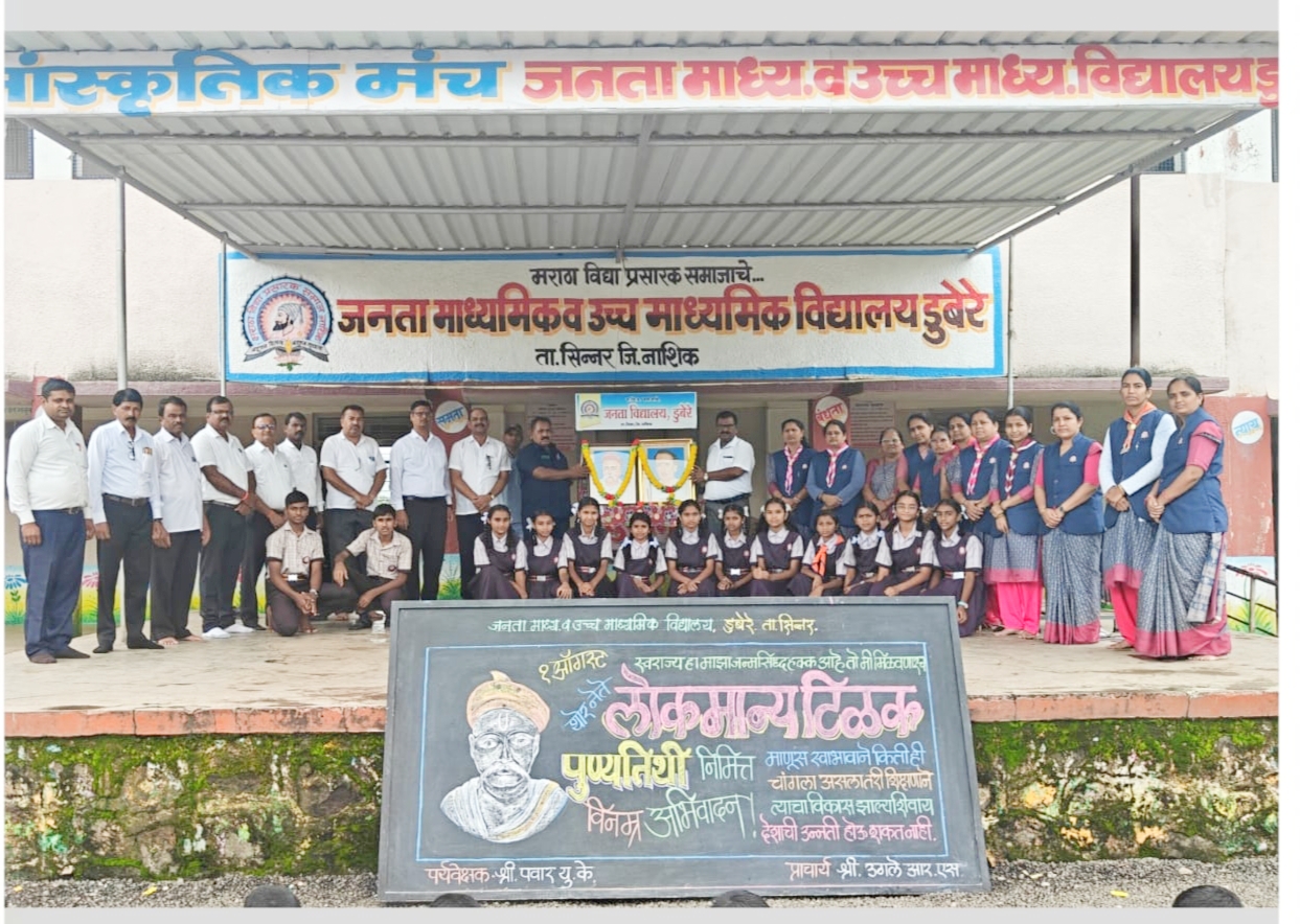 सिन्नर (प्रतिनिधी):- डुबेरे येथील जनता माध्यमिक व उच्च माध्यमिक विद्यालयात लोकमान्य टिळक यांची पुण्यतिथी व अण्णाभाऊ साठे यांची जयंती संयुक्तपणे साजरी करण्यात आली. कार्यक्रमाच्या अध्यक्षस्थानी विद्यालयाचे मुख्याध्यापक रंगनाथ उगले होते. व्यासपीठावर पर्यवेक्षक उल्हास पवार ज्येष्ठ शिक्षक पी.आर.करपे , सोमनाथ गिरी, सोमनाथ पगार,कचेश्वर शिंदे,रामदास वारुंगसे आदी उपस्थित होते. उपस्थितांच्या हस्ते टिळक व साठे यांच्या प्रतिमेचे पूजन करण्यात आले होते .टिळक व साठे यांच्या जीवन व कार्याचा परिचय अनन्या कडभाने, अनुष्का माळी, प्रिया वाजे व आराध्या वाजे या विद्यार्थ्यांनी करून दिला.इयत्ता आठवी तु- ब चे वर्गशिक्षक सोमनाथ गिरी यांच्या मार्गदर्शनाखाली विद्यार्थ्यांनी कार्यक्रमाचे आयोजन व नियोजन केले. यावेळी बोलतांना कार्यक्रमाचे अध्यक्ष उगले म्हणाले की,टिळक यांनी भारताला स्वातंत्र्य मिळवून देण्यासाठी अथक परिश्रम घेतले. आपल्या वृत्तपत्रातून इंग्रज सरकारविरुद्ध जनजागृती केली. म्हणून त्यांना असंतोषाचे जनक म्हणतात.तसेच अण्णाभाऊ साठे हे थोर समाजसुधारक होते.आपल्या साहित्यातून त्यांनी दलित, कष्टकरी व कामगारांचे प्रश्न मांडले.टिळक व साठे यांचे कार्य उल्लेखनीय आहे. सूत्रसंचालन मानसी वारुंगसे व धनश्री माळी यांनी केले तर अनुश्री कुंदे आभार व्यक्त केले .यावेळी कार्यक्रमास विद्यालयातील सुनिल ससाणे, शिवाजी गुरुळे,वरिष्ठ लिपिक राणी शिंदे आदींसह शिक्षक ,शिक्षकेत्तर कर्मचारी व विद्यार्थी उपस्थित होते.