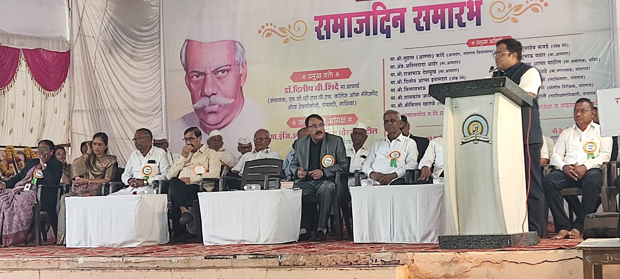 या कार्यक्रमाला अध्यक्ष म्हणून नांदगाव तालुका संचालक इंजि. अमित बोरसे (पाटील) होते. ते अध्यक्षिय मनोगतात म्हणाले की, सत्यशोधक विचारसरतीवर आधारीत संस्थापकांनी इ.स.१९१४ ला. ही शिक्षण संस्था स्थापन केली. या संस्थेचा इतिहास पुढच्या पीढीला माहिती व्हावा म्हणून कर्मवीर रावसाहेब थोरात यांचा जन्मदिन हा मविप्र संस्थेत समाजदिन म्हणून साजरा करण्यात येतो. सुरवातीला संस्थेला राजाश्रय मिळाला म्हणून ही संस्था प्रतिकूल काळातही टिकून राहिली. व आज या संस्थेचा मोठा विस्तार झाला आहे. कर्मवीरांनी जिल्ह्यातील अनेक देणगी दारांकडुन जलशा सारखे कार्यक्रम करुन या संस्थेचा विकास घडवुन आणला.आज नांदगांव तालुक्यात मविप्र संस्थेची प्रगती होत आहे. होरायझन ॳॅकेडमी, विज्ञानाच्या विविध लॅब, मेडिकल सुविधा, तसेच व्यवसाय कोर्सेस सुरु असुन शिक्षणाच्या सुविधा उपलब्ध आहेत. असे मनोगत नांदगाव तालुका संचालक इंजि.अमित बोरसे (पाटील) यांनी केले. यावेळी शाळेची माजी विद्यार्थीनी विद्या पाटील व स्कूल कमिटी अध्यक्ष विजय काकळीज यांनी ही संस्थेबाबत आदरभाव व्यक्त केला. कार्यक्रमाचे प्रास्ताविक चव्हाण सर यांनी केले. याप्रसंगी न्यु.इंग्लिश स्कूलच्या विद्यार्थ्यांनीनी समाजधुरीनांचा गौरव करणारा सुंदर असा पोवाडा सादर करुन वातावरणात एक जल्लोष निर्माण केला.याला कल्पना अहिरे मॅडम यांनी संगीताची उत्तम साथ दिली.कार्यक्रमाचे सुत्रसंचलन प्रा. बी.के. पवार, दत्तात्रय भिलोरे, डी.डी. पाटील यांनी केले प्रा. एस.ए. मराठे यांनी आभार मानले . या कार्यक्रमास नांदगांव महाविद्यालय, न्यु.इंग्लिश स्कूल, होरायझन, औद्योगिक प्रशिक्षण संस्था नांदगांव,आदर्श प्राथमिक शाळा,मविप्र बाह्य रुग्ण कक्ष नांदगाव या शाखेचे सर्व कर्मचारी यांनी कार्यक्रम यशस्वीतेसाठी परिश्रम घेतले. पसायदानाने कार्यक्रमाची सांगता झाली.