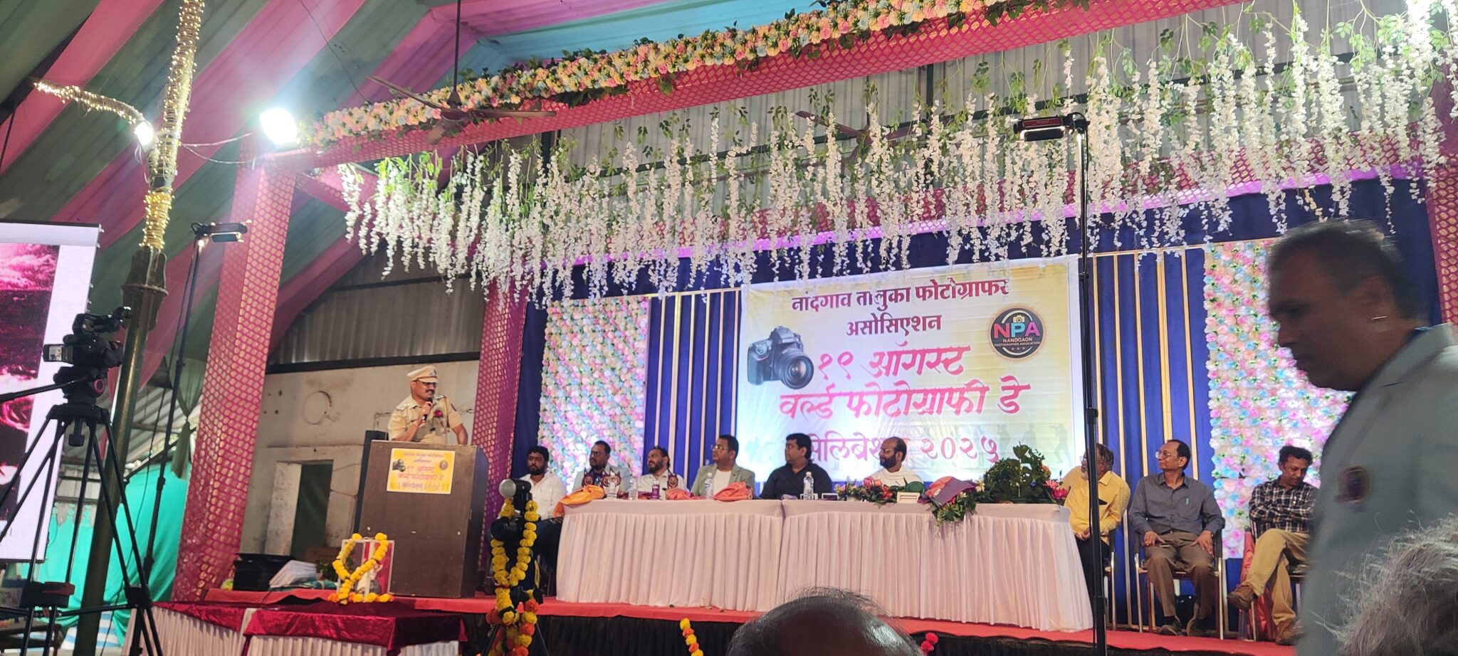 यावेळी या संघटनेला त्यांनी यानिमित्ताने शुभेच्छा दिल्या. या प्रसंगी मा.नगराध्यक्ष नांदगाव नगरपरिषदचे अध्यक्ष राजेश (बबीकाका) कवडे, मार्गदर्शक रोशन जी ठाकूर, पोलिस निरीक्षक दिगंबर भदाणे, फोटो ग्राफी असोसिएशन चे अध्यक्ष अनिल शिंदे, सागर हिरे,संजय सानप, पत्रकार संजीव निकम, संजीव धामणे, बब्बुभाई शेख, मारुती जगधने, आदी व्यासपीठावर उपस्थित होते. यावेळी फोटोग्राफी ही बातम्या साठी किती महत्वाची आहे व पुर्वी किती महतप्रयासाने बातमी साठी धडपड करावी लागत होती याचे उदाहरण देऊन आज फोटोग्राफी क्षेत्राने फारमोठी प्रगती केली आहे तरीही या क्षेत्रात अपडेट राहाण्याचा सल्ला जेष्ठ पत्रकार संजीव निकम यांनी शुभेच्छा देताना सल्ला दिला. तर हाच धागा पकडून संजीव धामणे यांनी पुर्वी फोटो काढायचा म्हणजे बागुलबुवाच्या घरात जावे लागत असे प्रचंड मेहनत घेऊन फोटो काढला जात असे पण आज विज्ञान तंत्रज्ञानाच्या विकासामुळे या क्षेत्रात प्रगती झाली त्यामुळे बातमी साठी सहज फोटो आता उपलब्ध होत आहेत सर्व फोटो ग्राफर असोसिएशनला यावेळी शुभेच्छा दिल्या व संघटनेमुळे एकीचे बळ निर्माण झाले त्यामुळे अधिक विकास होण्यास मदत होईल असे त्यांनी प्रतिपादन केले