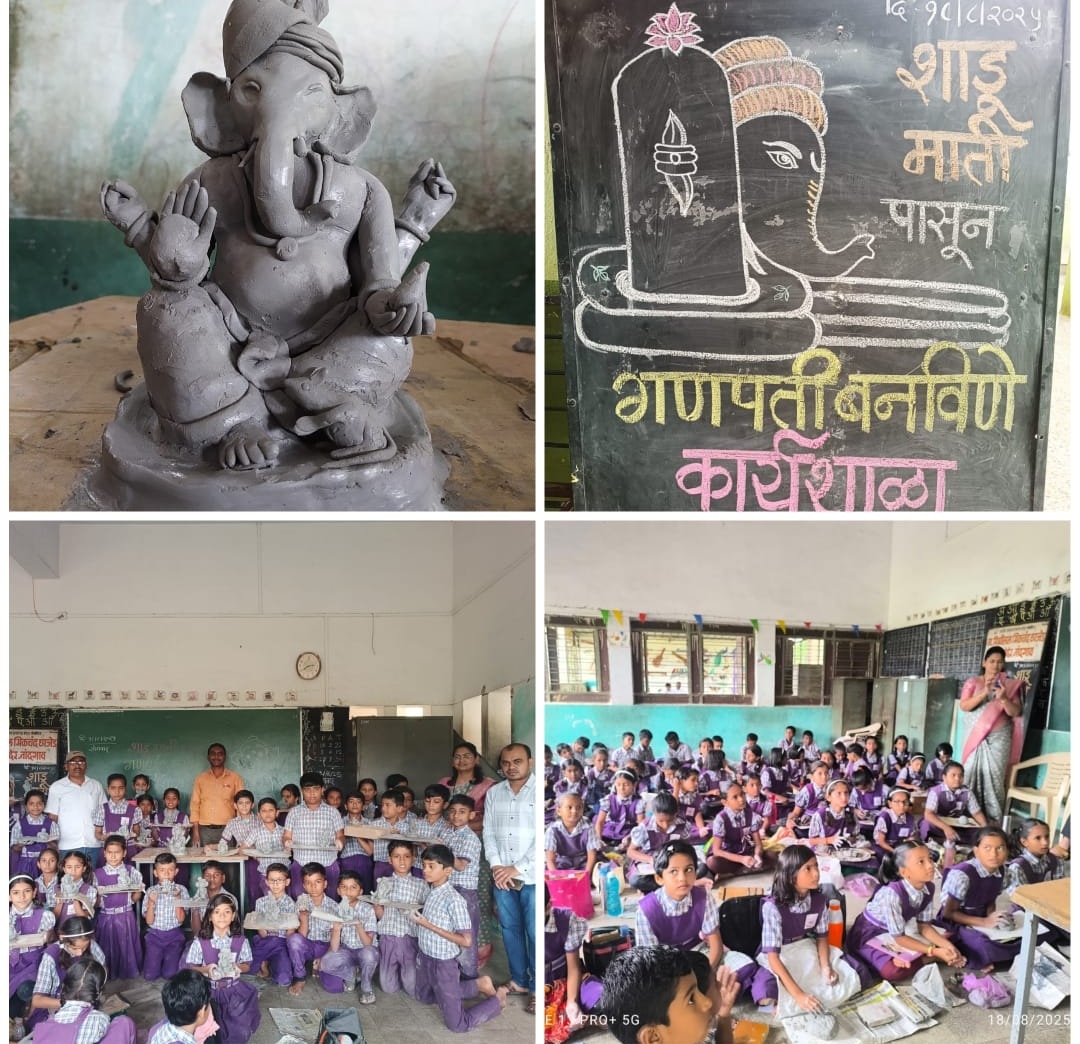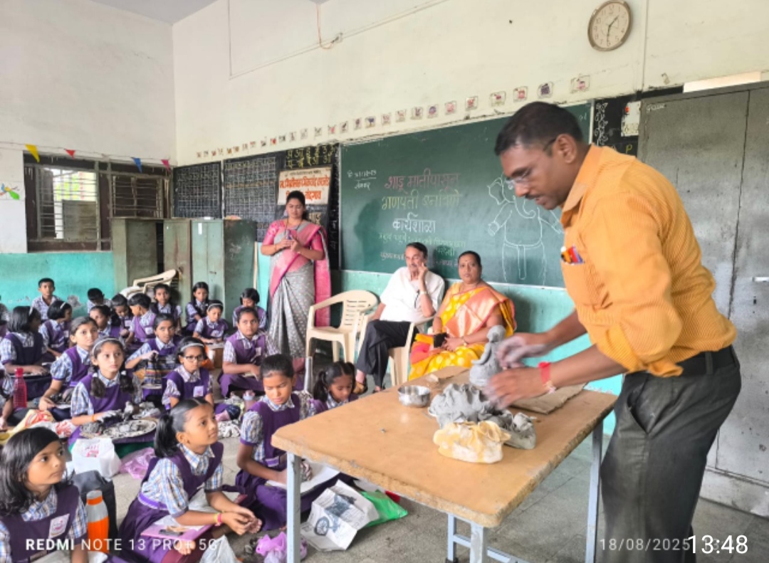या हेतूने कार्यशाळेचे आयोजन करण्यात आले . कार्यशाळेचे उद्घाटन शालेय समितीचे अध्यक्ष श्री विजय अण्णा परदेशी यांच्या हस्ते झाले. विद्यालयाच्या मुख्याध्यापिका सौ जाधव मॅडम यांनी विद्यार्थ्यांना शुभेच्छा दिल्या. कार्यशाळेत व्ही.जे. हायस्कूल येथील कलाशिक्षक श्री चव्हाण सर व श्री शशिकांत खांडवी सर यांनी गणेश मूर्ती तयार करण्याचे प्रात्यक्षिक दाखवले व विद्यार्थ्यांना गणेश मूर्ती चे सर्व भाग बनवण्याचे कौशल्य सांगितले तसेच सर्व विद्यार्थ्यांनी या गणेश मूर्ती घरी बसवण्याचा संकल्प केला