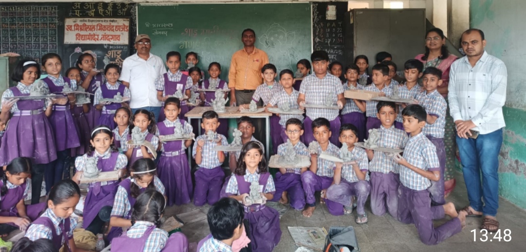 नांदगाव (प्रतिनिधी) नाशिक शिक्षण प्रसारक मंडळ संचलित स्व.मि.भि छाजेड विद्यामंदिर नांदगाव येथे दरवर्षीप्रमाणे शाडू माती पासून पर्यावरणपूरक गणपती बनवण्याची कार्यशाळा पार पडली या कार्यशाळेमध्ये इयत्ता तिसरी व चौथीच्या विद्यार्थ्यांनी पर्यावरण पूरक गणेश मूर्ती साकारल्या, विद्यार्थ्यांच्या सृजनशीलतेला वाव देण्यासाठी तसेच, शाडू मातीची गणेशमूर्ती ही पर्यावरणपूरक मानली जाते, कारण ती नैसर्गिक मातीपासून तयार केली जाते आणि पाण्यात लवकर विरघळते, त्यामुळे जलप्रदूषण टाळता येते.