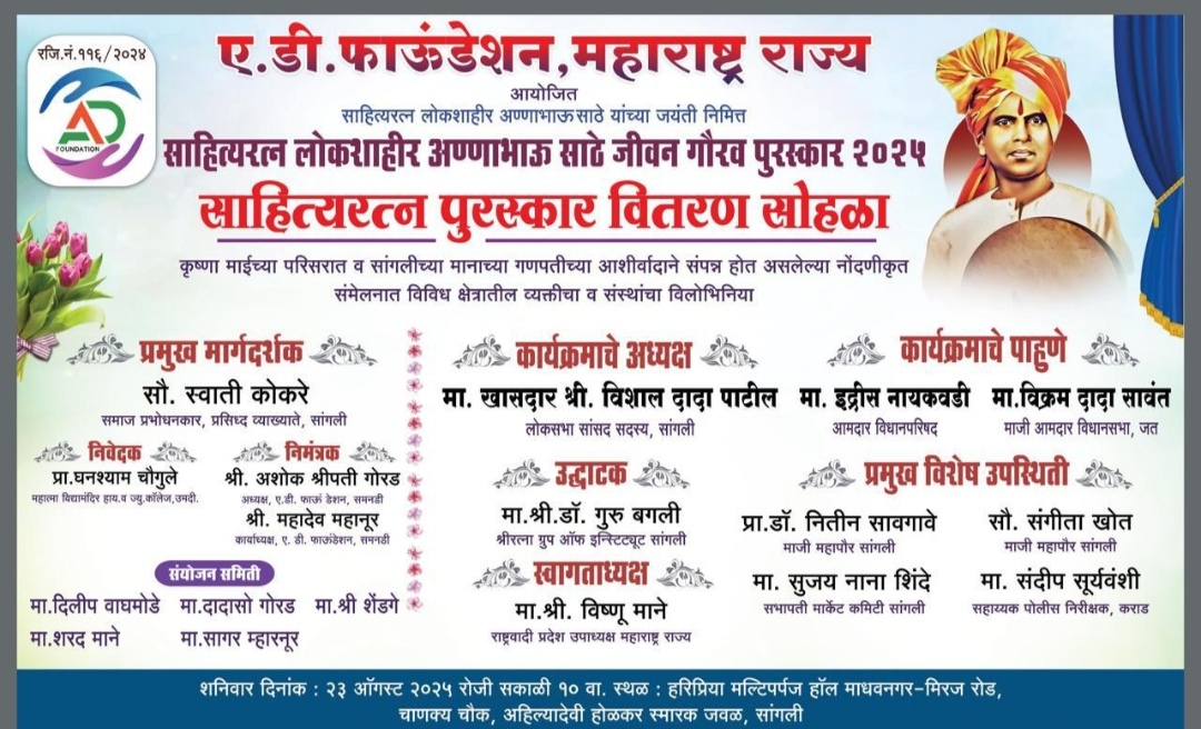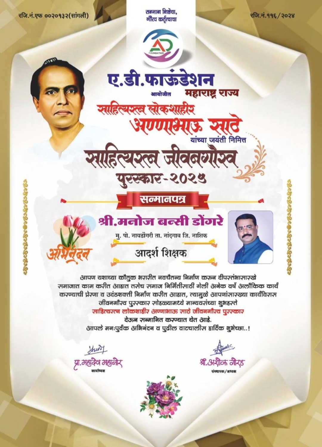 नांदगाव ( प्रतिनिधी)*जिल्हा परिषद प्राथमिक शाळा पिंपरखेड येथील शिक्षक मनोज बन्सी डोंगरे यांना ए. डी. फाऊंडेशनचा सांगली चा अण्णाभाऊ साठे यांच्या जयंतीनिमित्त साहित्यरत्न जीवन गौरव पुरस्कार जाहीर झाला आहे.नांदगाव तालुक्यात शिक्षण क्षेत्रात कार्यरत असणारे श्री मनोज डोंगरे यांचे उपक्रमशील शिक्षण, ग्रामीण भागातील गुणवत्तापूर्ण शिक्षण, सामाजिक जाणीव जागृती, शिक्षण माध्यमातून सुरू असलेले सामाजिक व शैक्षणिक कार्य नेहमीच इतरांना प्रेरणादायी ठरत आहे