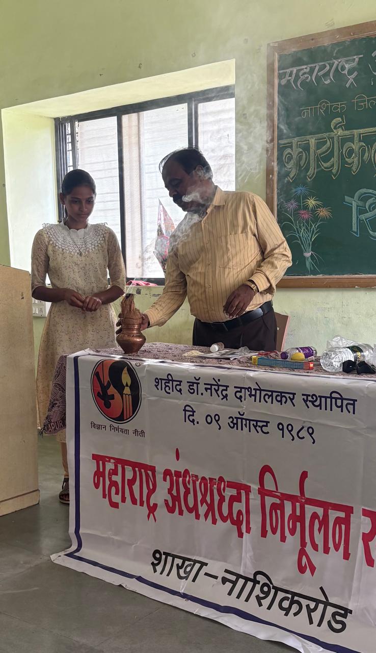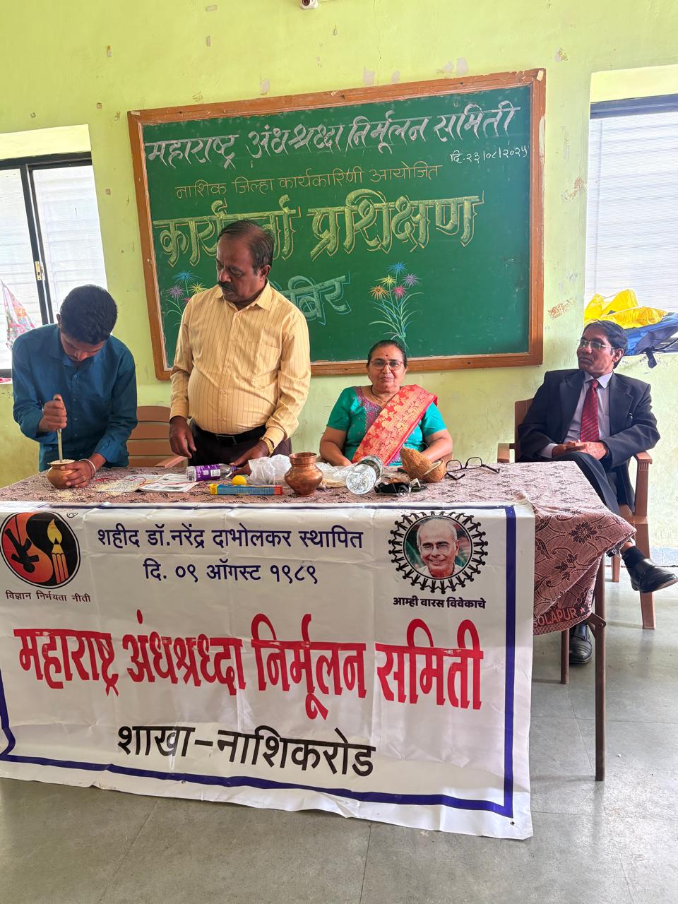 चांदवड (प्रतिनिधी ) चांदवड येथील महाविद्यालयात महाअंनिस नाशिक जिल्ह्याच्यावतीने वैज्ञानिक (चमत्कारांचे) प्रयोग शिकवण्याचा प्रशिक्षण कार्यक्रम झाला.प्रथम जिल्हा कार्याध्यक्ष प्रा. आशा लांडगे व जिल्हा प्रधान सचिव अरुण घोडेराव यांनी चळवळीचे गीत म्हटले. नंतर जिल्हा कार्याध्यक्ष प्रा. आशा लांडगे यांनी कार्यक्रमाचे प्रास्ताविक करुन अंनिसची पंचसूत्री थोडक्यात विशद केली. प्राचार्य डॉ. पालकर यांनी अंनिसच्या कार्याची गरज का हे सांगितले. जिल्हा प्रधान सचिव अरुण घोडेराव यांनी अंनिसचे सोपे व निवडक प्रयोग शिकवले व त्यांची विश्लेषणात्मक माहिती दिली, विद्यार्थ्यांकडून प्रयोग करून घेतले. यात सर्व विद्यार्थी मित्र – मैत्रिणींनी सहभाग घेतला. संपर्क शाखा स्थापन करण्यासाठी प्रयत्न केले. समर्थ केदारे याने आभार मानले.