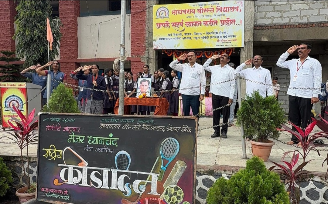 ओझर (प्रतिनिधी )दि.२९ वार्ताहर येथील मविप्र समाजाचे माधवराव बोरस्ते विद्यालयात राष्ट्रीय क्रीडा दिनानिमित्त आयोजित केलेल्या कार्यक्रमात प्रारंभी मेजर ध्यानचंद यांच्या प्रतिमेचे पूजन करून क्रीडा ध्वजाचे ध्वजारोहण मुख्याध्यापक सोपान वाटपाडे यांच्याहस्ते झाले. प्रास्ताविक याप्रसंगी विद्यार्थ्यांनी मेजर ध्यानचंद यांच्या जीवनावर भाषणे केली. शिक्षक प्रभाकर लवांड मनोरमा उज्वला जाधव यांनी क्रीडा दिनाविषयी माहिती दिली. यावेळी व्यासपीठावर उपमुख्याध्यापक सतीश केदार पर्यवेक्षक दशरथ शिंदे भाऊसाहेब रौंदळ आत्माराम शिंदे दादासाहेब सोनवणे हेमंत भट बाबासाहेब गायकवाड बाबासाहेब लभडे नरेंद्र डेरले उपस्थित होते. अध्यक्षीय भाषणात मुख्याध्यापक सोपान वाटपाडे यांनी विद्यार्थ्यांना खेळाचे महत्व पटवून देऊन खेळातून आपला मानसिक शारीरिक विकास होतो असे आवाहन केले. फलक रेखाटन मोनाली निकम यांनी केले. सूत्रसंचालन शितल हांडोरे यांनी केले. आभार क्रीडा शिक्षक प्रभाकर लवांड यांनी मानले.