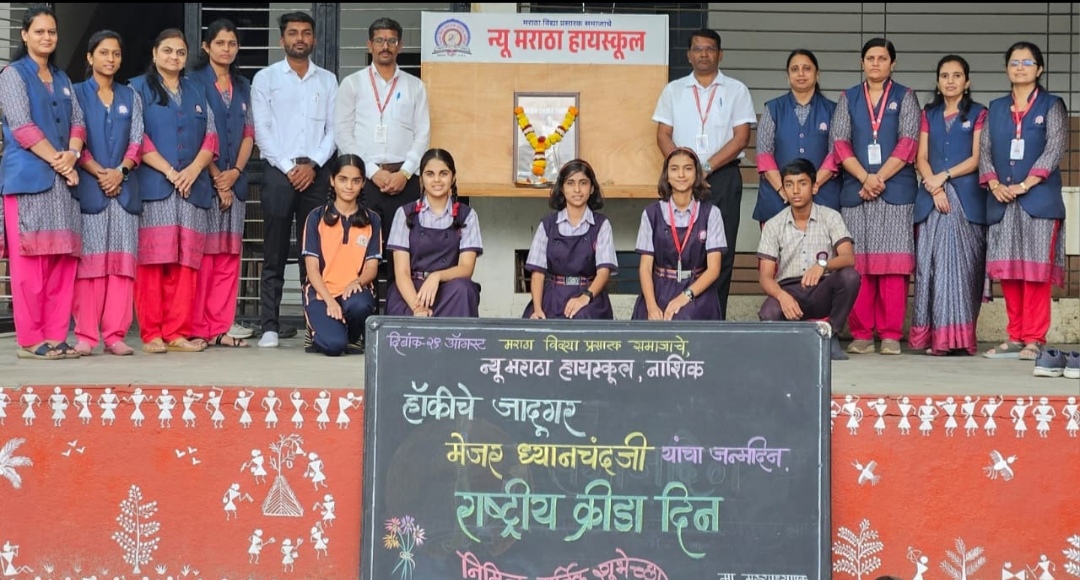 नाशिक*|मराठा विद्या प्रसारक समाज संस्थेचे न्यू मराठा हायस्कूलमध्ये राष्ट्रीय क्रीडा दिन उत्साहात साजरा करण्यात आला.कार्यक्रमाच्या अध्यक्षस्थानी विद्यालयाचे मुख्याध्यापक ज्ञानेश्वर शिंदे हे होते.व्यासपीठावर ज्ञानेश्वर कोतवाल,क्रीडा शिक्षक बाळासाहेब गायकवाड उपस्थित होते.उपस्थित मान्यवरांच्या हस्ते मेजर ध्यानचंद यांच्या प्रतिमेचे पुजन करून कार्यक्रमास सुरुवात करण्यात आली. विद्यार्थी मनोगतात वेदीका पाटील,पार्थ आहिरे, अनुष्का कदम यांनी क्रीडा दिनाचे महत्त्व सांगितले.शिक्षक मनोगतातुन बाळासाहेब गायकवाड यांनी क्रिडा दिनाचे महत्त्व सांगत विद्यार्थी जीवनात क्रीडाक्षेत्र किती महत्त्वाचे असते.विद्यार्थ्यांनी त्याकडे सकारात्मक दृष्टिकोनातून बघून आपला शारीरिक,मानसिक विकास साधला पाहिजे हे सांगितले.अध्यक्षीय मनोगतातुन ज्ञानेश्वर शिंदे यांनी व्यक्तिच्या जीवनातील खेळाचे महत्त्व सांगितले.कार्यक्रम यशस्वी होण्यासाठी सर्व शिक्षक,शिक्षकेतर कर्मचारी, विद्यार्थी यांनी प्रयत्न केले.सुंदर फलक लेखन रुपाली शेडगे यांनी केले.तर सुत्रसंचालन व आभार तेजल निकम,अनुष्का देवरे यांनी केले.