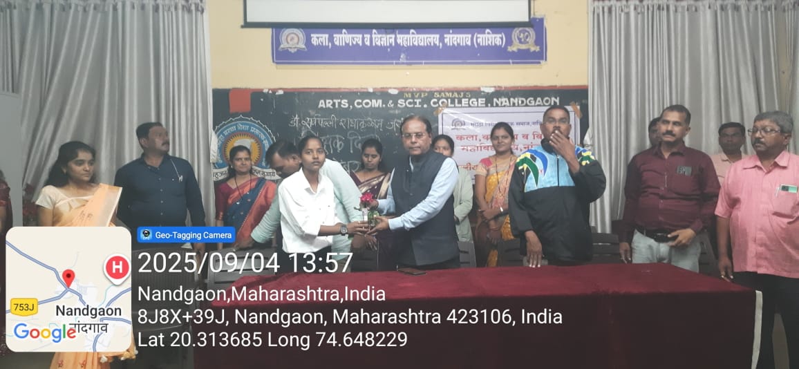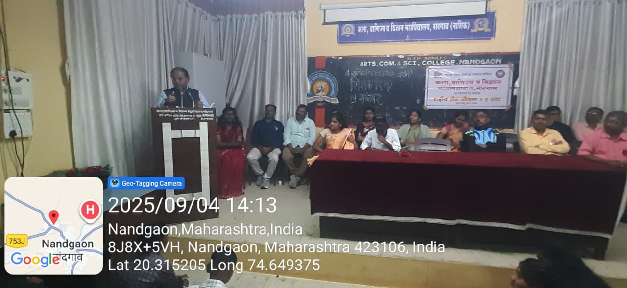 नांदगाव (प्रतिनिधी ) आज कला,वाणिज्य व विज्ञान महाविद्यालय, नांदगाव येथे राष्ट्रीय सेवा योजना+2 स्तरच्यावतीने डॉ.सर्वपल्ली राधाकृष्णन यांची जयंती ‘शिक्षक दिन’ म्हणून मोठ्या उत्साहात साजरी करण्यात आली. शिक्षक दिनाचे औचित्य साधून विद्यार्थी शिक्षकांनी वर्गवार वेळापत्रकानुसार अध्यापन करून शिक्षक कर्तव्यांचाअनुभव घेतला. याप्रसंगी महाविद्यालयाच्या सेमिनार हॉलमध्ये महाविद्यालयाचे प्राचार्य डॉ.आर.एन.भवरे यांच्या शुभहस्ते भारतरत्न डॉ. सर्वपल्ली राधाकृष्णन यांच्या प्रतिमेचे पूजन करण्यात आले.