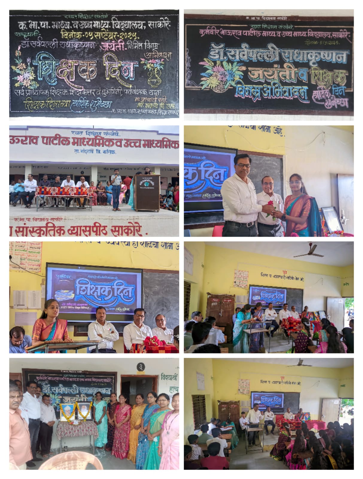 साकोरे (प्रतिनिधी)– रयत शिक्षण संस्थेचे कर्मवीर भाऊराव पाटील माध्यमिक व उच्च माध्यमिक विद्यालय येथे शुक्रवार दि. 5 सप्टेंबर 2025 रोजी शिक्षक दिन मोठ्या उत्साहात साजरा करण्यात आला. या कार्यक्रमाचे आयोजन विद्यालयाच्या सांस्कृतिक विभागामार्फत करण्यात आले होते.कार्यक्रमाच्या अध्यक्षस्थानी विद्यालयाचे आदरणीय प्राचार्य श्री. झाल्टे डी. एस. उपस्थित होते. विशेष बाब म्हणजे इयत्ता दहावीच्या विद्यार्थ्यांनी संपूर्ण कार्यक्रमाचे सूत्रसंचालन करून सर्व शिक्षकांचा यथोचित सत्कार केला. विद्यार्थ्यांनी सादर केलेल्या सुंदर भाषणांनी वातावरण भारावून गेले.शिक्षकांविषयी कृतज्ञता व्यक्त करणारी अनेक भाषणे विद्यार्थ्यांनी दिली. शिक्षकांनी दिलेल्या संस्कारांची, शिक्षणातील योगदानाची आणि जीवन मार्गदर्शनाची उज्ज्वल परंपरा विद्यार्थ्यांनी मनापासून व्यक्त केली.कार्यक्रमाची सांगता व समारोपाचे शब्द इयत्ता सातवीच्या विद्यार्थ्यांनी प्रभावीपणे सादर केले. त्यामुळे कार्यक्रमाला एक आगळावेगळा आणि संस्मरणीय स्वरूप लाभले.