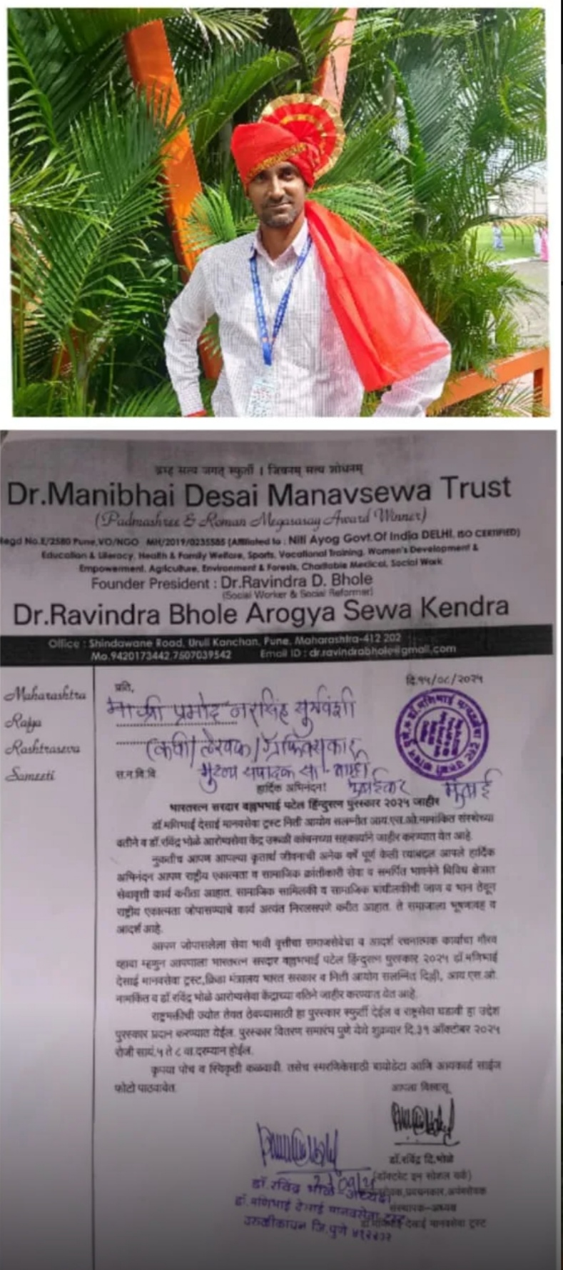 मुंबई (प्रतिनिधिमुंबई : मुंबई शहरातील साहित्यिक, फिल्म मेकर, सा.आम्ही मुंबईकर वृत्तपत्राचे संपादक प्रमोद नरसिंग सूर्यवंशी यांना भारतरत्न सरदार वल्लभभाई पटेल पुरस्कार..२०२५ जाहीर झाला आहे. डॉ.मणिभाई देसाई मानवसेवा ट्रस्ट, क्रीडा मंत्रालय भारत सरकार निती आयोग संलग्नित दिल्ली,आय.एस. ओ. नामांकित प्रा.डॉ.रविंद्र भोळे आरोग्य सेवा केंदाच्या वतीने जाहीर करण्यात आला.. पुणे येथे कार्यक्रम आयोजित करण्यात आला आहे.प्रमोद सूर्यवंशी यांचे सर्व निस्वार्थ सेवा सतत केल्याबद्दल हा पुरस्कार जाहीर करण्यात आला. हा यांचा दिल्लीचा दुसरा पुरस्कार जाहीर होत आहे…