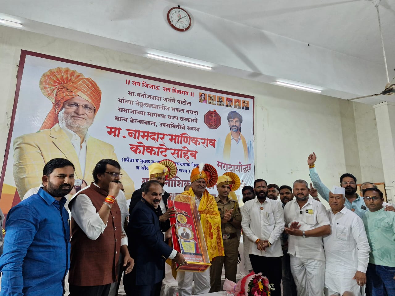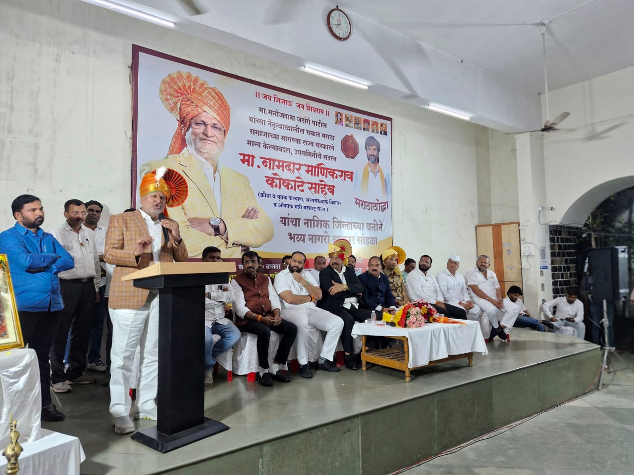 . मराठा आरक्षण उप समितीचे अध्यक्ष नामदार राधाकृष्ण विखे पाटील, तसेच मंत्रिमंडळातील सदस्य आणि मार्गदर्शक मुख्यमंत्री देवेंद्रजी फडवणीस, उपमुख्यमंत्री एकनाथ शिंदे व अजित पवार यांच्या मार्गदर्शनाखाली मराठा समाजाच्या मागण्या कायदेशीर पद्धतीने पूर्ण केल्या असल्याचे त्यांनी सांगितले.विशेषतः, ब्रिटिश व निजामशाही काळातील गॅझेट मान्यतेप्रमाणे समाजातील सर्व पात्र सदस्यांना आरक्षणाचा लाभ देण्याची व्यवस्था करण्यात येणार असल्याचे त्यांनी स्पष्ट केले. एक गावातील एका आडनावाचा व्यक्ती जर ओबीसी प्रमाणपत्र पात्र असेल,तर त्या गावातील सर्व समाजबंधूंना त्या प्रमाणपत्राचा लाभ दिला जाईल.नामदार माणिकरावजी कोकाटे यांनी मराठा समाजाच्या उज्वल भविष्यासाठी प्रामाणिकपणे व कटिबद्धतेने कार्य करण्याचा समाजबंधूंना आश्वासन दिले.कार्यक्रमाचे प्रास्ताविक मराठा क्रांती मोर्चा राज्य समन्वयक करण गायकर यांनी केले. समाजाच्या वतीने नानासाहेबांच्या विलास पांगरकर केशवांना पाटील यांनी मनोगत व्यक्त केले. मराठा क्रांती मोर्चा समन्वयक बंटी भागवत यांनी मराठा समाजाच्या नाशिक जिल्ह्याच्या पाच मागण्यांचे वाचन करून त्यांची तात्काळ पूर्तता कोकाटे साहेबांनी करण्याची मागणी केली.नितीन सुगंधी यांनी कार्यक्रमाचे सुत्रसंचालन केले, तर प्रफुल वाघ्यांनी आभार व्यक्त केले. विशेष आभार मानण्यात आले की,आंदोलनाच्या काळात नाशिकचे ग्रामदैवत कालिका माता मंदिर येथील हॉल उपलब्ध करून दिल्याबद्दल तसेच नाशिक शहर पोलीस व नाशिक ग्रामीण पोलीस यांनी आंदोलनात सहकार्य केल्याबद्दल,आणि त्यानिमित्ताने शाल व श्रीफळ देऊन नामदार कोकाटे साहेबांचा सत्कार करण्यात आला. यावेळी या सत्कार समारंभासाठी शिवाजी मोरे,विठ्ठल राजे उगले,आशिष हिरे, व्यंकटेश मोरे, प्रवीण पाटील, दीपक भदाणे, राजेंद्र निंबाळते, भारत पिंगळे, नवनाथ तांबे, डॉ. उल्हास बोरसे, सुनील गायकवाड, योगेश गांगुर्डे, रामभाऊ जगताप, शिवाजी हंडोरे, नाना शिंदे, सुदाम खालकर, बाजीराव कमानकर, मनोज ठाकरे, दादासाहेब जोगदंड, संगीताताई सूर्यवंशी, सविता वाघ, विकी गायधनी, नितीन काळे, हार्दिक निगळ, विष्णुपंत मैसधुने, सचिन पिंगळे, योगिता आहेर, बाळासाहेब जाधव, दिनकर कांडेकर आणि समाजबंधू मोठ्या संख्येने उपस्थित होते.