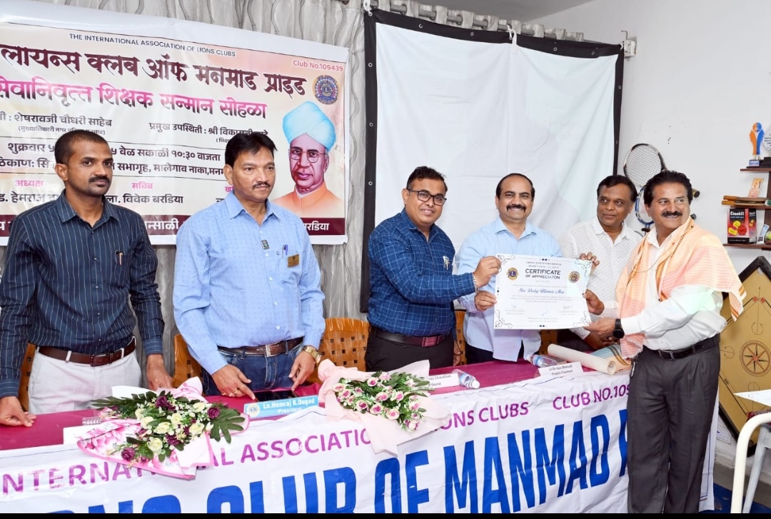 मनमाड ( प्रतिनिधी )मनमाड येथील श्री संत बार्णबा प्राथ. व उच्च प्राथमिक विद्यालयाचे मुख्याध्यापक श्री.दादाजी उत्तमराव आहिरे सर यांना लायन्स क्लब ऑफ मनमाड प्राइड यांचेकडून मनमाड नगरपालिकेचे मुख्याधिकारी श्री. शेषराव चौधरी व डॉ. भन्साळी यांचे हस्ते उपक्रमशील मुख्याध्यापक हा पुरस्कार देऊन गौरविण्यात आले. यावेळी लायन्स क्लबचे अध्यक्ष ला. अॅड. हेमराज दुगड, सचिव ला. विवेक बरडिया, खजिनदार संजय मुथा, मनमाड नगरपालिकाचे प्रशासनाधिकारी श्री. विकासजी तरटे व लायन्स क्लबचे पदाधिकारी व शिक्षकवृंद उपस्थित होते. दादाजी अहिरे यांना हा पुरस्कार मिळाल्याने त्यांचे सर्वत्र अभिनंदन होत आहे.सरांना या अगोदर नाशिक जिल्हा शिवसेनेचा उपक्रमशील मुख्याध्यापक पुरस्कार हा महाराष्ट्र राज्याचे सहकार मंत्री दादाजी भुसे साहेब यांचे हस्ते पुरस्कार देऊन गौरविण्यात आलेले आहेत, कालिका देवी संस्थान तर्फे नाशिक आदर्श मुख्याध्यापक हा पुरस्कार देण्यात आलेला आहेत,तसेच नाशिक डायोसेसन संस्थेचा उपक्रमशील मुख्याध्यापक हा पुरस्कार दिलेला आहेत, रविदास प्रबोधनी नाशिक यांचा उपक्रमशील मुख्याध्यापक हा पुरस्कार मिळालेला आहेत, मागील वर्षी ५ सप्टेंबरला २४ ला नाशिक जिल्ह्याचे पोलिस आयुक्त कर्णिक साहेब यांच्या हस्ते आदर्श मुख्याध्यापक हा पुरस्कार देऊन गौरविण्यात आलेले आहेत.