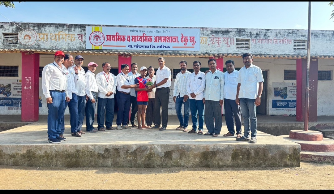 ढेकू. ( प्रतिनिधी ) ढेकू आश्रम शाळेतील विद्यार्थी सागर प्रल्हाद राठोड 100 मीटर धावणे स्पर्धेत तालुक्यात प्रथम क्रमांक प्राप्त करून जिल्हास्तरावर ती निवड. शालेय शिक्षण व क्रीडा विभाग जिल्हा क्रीडा अधिकारी यांच्यातर्फे सन 2025-26वर्षतील नांदगावयेथे तालुका स्तरीय विविध क्रीडा स्पर्धा संपन्न झाल्या त्यामध्ये वैयक्तिक 100 मीटर धावणे स्पर्धेत ढेकू माध्यमिक आश्रम शाळेतील इयत्ता दहावीचा विद्यार्थी सागर प्रल्हाद राठोड 17 वर्ष वयोगटातील स्पर्धेत तालुक्यातून प्रथम क्रमांक प्राप्त केला, तसेच त्याची जिल्हास्तरावर निवड झाली तर 200 मीटर धावणे स्पर्धेमध्ये सुनील रमेश राठोड याचा तालुकास्तरावर द्वितीय क्रमांक आला,,लांब उडी स्पर्धेत शुभम चरणदास चव्हाण इयत्ता दहावी याने तालुक्यातून तृतीय क्रमांक प्राप्त केला. या सर्व विद्यार्थ्यांना शाळेचे मुख्याध्यापक श्री जितेंद्र थोरात क्रीडा मार्गदर्शक श्री भाऊसाहेब देवरे श्री सना कामडी,श्री रवींद्र चव्हाण,.श्री रवींद्र धाकतोडे या शिक्षकांचे, व शाळेचे अधीक्षक श्री कोठावदे नितीन एकनाथ या सर्वांचे मार्गदर्शन लाभले, या सर्व विद्यार्थ्यांचे ग्रामोदय शिक्षण संस्थेचे संस्थापक सरचिटणीस माननीय श्री कृष्णरावजी नेरे सर संस्थेचे अध्यक्ष श्री योगेशजी हिरे व इतर बहुजन कल्याण विभागाचे नाशिक चे सहाय्यक संचालक श्री संतोष चव्हाण साहेब यांनी या विद्यार्थ्याचे अभिनंदन केले व जिल्हास्तरीय स्पर्धेसाठी शुभेच्छा दिल्या.