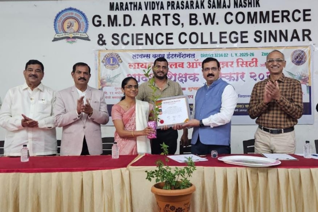 वसंत गोसावी, (सिन्नर प्रतिनिधी) :शिक्षक म्हणजे फक्त ज्ञानदान करणारे नाहीत तर विद्यार्थ्यांच्या मनामनात प्रेरणेची ज्योत पेटवणारे मार्गदर्शक असतात. अशाच एका प्रेरणादायी व्यक्तिमत्त्वाला नुकताच मानाचा सन्मान मिळाला आहे.मराठा विद्या प्रसारक समाजाच्या लोकनेते शंकरराव बाळाजी वाजे विद्यालयातील विज्ञान विषयाच्या शिक्षिका सौ. प्रिती रामराव पवार (प्रिती अमोल खैरनार) यांना लायन्स क्लब ऑफ सिन्नर सिटी तर्फे आदर्श शिक्षक पुरस्कार प्रदान करण्यात आला. हा पुरस्कार आंतरराष्ट्रीय स्तरावर सेवाभावी कार्य करणाऱ्या प्रतिष्ठित संस्थेमार्फत दिला जाणे हे विशेष महत्त्वाचे मानले जात आहे.हा सन्मान सोहळा गुरुवर्य मामासाहेब दांडेकर कला, भगवंतराव वाजे वाणिज्य व विज्ञान महाविद्यालय, सिन्नर येथे दिमाखात पार पडला. यावेळी पुरस्काराचे वितरण लायन्स क्लब अध्यक्ष उद्योजक बबन वाजे, हेमंत नाना वाजे, डॉ. विजय लोहारकर, मनीष गुजराथी, डॉ. गणेश पाटील, अपर्णा क्षत्रिय, सचिव जयवंत काळे, खजिनदार प्रशांत शिंदे, प्राचार्य एन. यू. पाटील तसेच प्रमुख पाहुणे प्राचार्य सानप यांच्या शुभहस्ते झाले.याप्रसंगी सौ. प्रिती मॅडम म्हणाल्या, “अशा पुरस्कारामुळे काम करण्याची उर्जा व उत्साह दुप्पट होतो. विद्यार्थ्यांसाठी आणखी काही वेगळे करण्याची प्रेरणा मिळते.”सौ. प्रिती पवार म्हणजेच “मूर्ती लहान पण कीर्ती महान”. विज्ञान प्रदर्शन असो वा परिपाठ, शालेय उपक्रम असो वा विद्यार्थी प्रोत्साहन – पवार मॅडम नेहमीच अग्रस्थानी दिसतात.या यशाबद्दल संस्थेचे सरचिटणीस अॅड. नितीन ठाकरे, संचालक कृष्णाजी भगत, मुख्याध्यापक रायते सर, उपमुख्याध्यापक व पर्यवेक्षक, सर्व शिक्षकवर्ग, प्रा. जयंत महाजन, प्रा. संजय पवार, सौ. सुनिता पवार, सौ. स्वाती संजय डेरे, कीर्ती पवार, सौ. लता पवार, मिलिंद पवार, सुकदेव दादा पवार, शिवाजी दादा पवार, सोनांबे पंचक्रोशीतील नागरिक, सिन्नर सह्याद्री संचालक सुदाम शिंदे, मधुकर डावरे तसेच असंख्य सिन्नरकरांनी मन:पूर्वक अभिनंदन केले. “शिक्षक हेच खऱ्या अर्थाने समाजाचे दिशादर्शक आहेत” हे वचन सौ. प्रिती पवार मॅडमनी आपल्या कार्यातून सिद्ध करून दाखवले आहे.